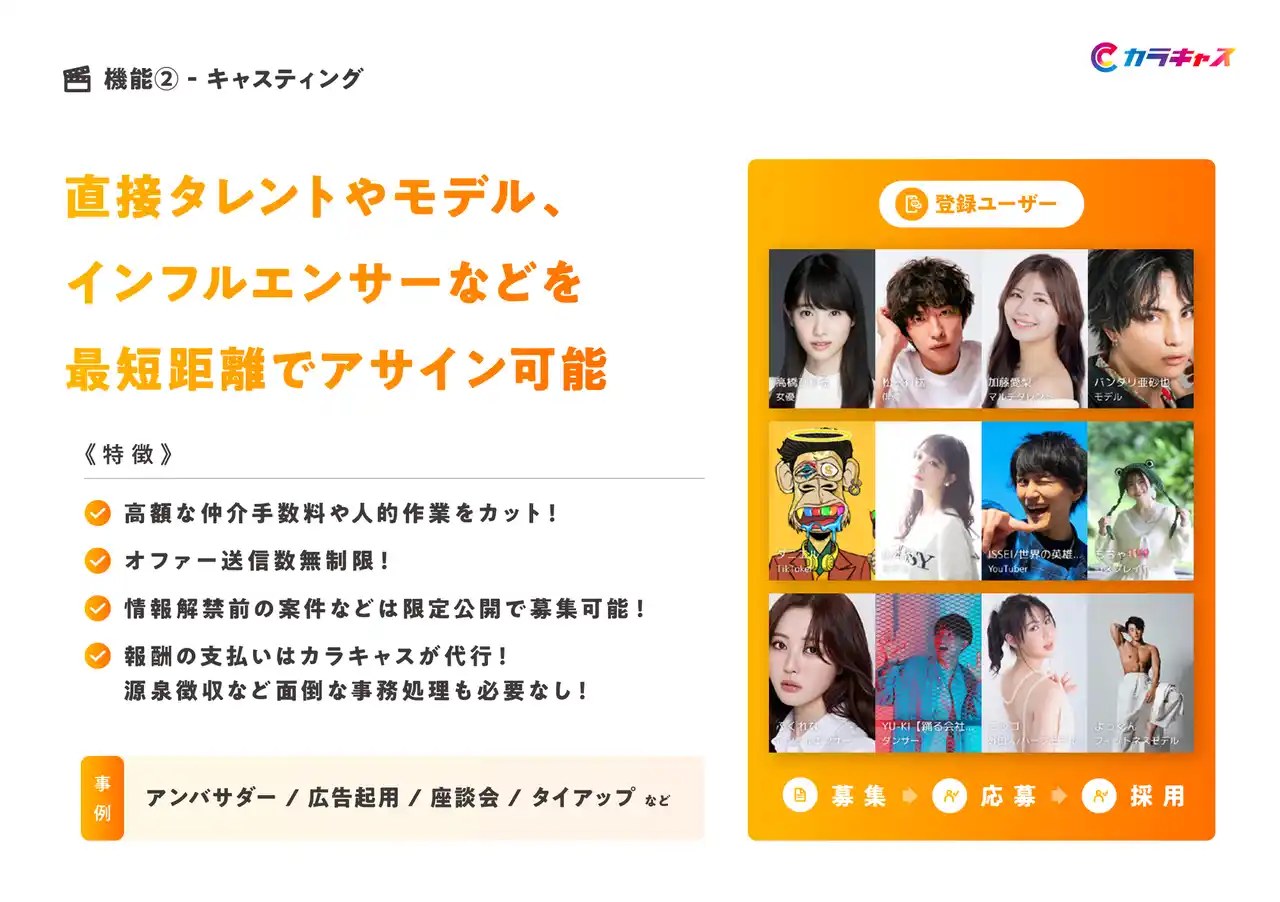 | タレントやモデル、インフルエンサーなどへ様々なキャストへあらゆるお仕事の依頼を可能に。 | |||