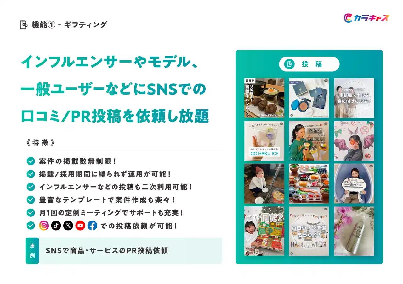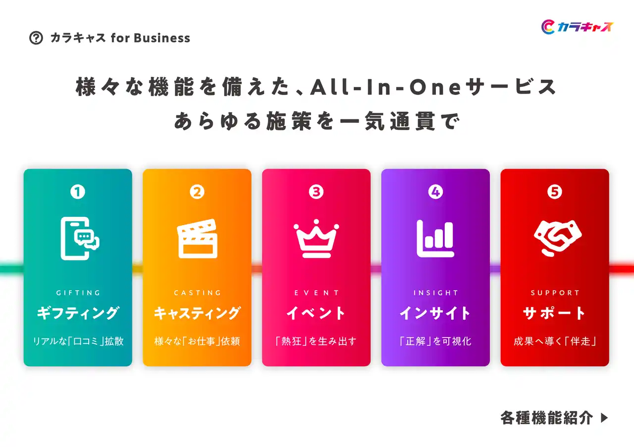 | 「カラキャス」では、法人様向けのサービスとして、ギフティング・キャスティング・イベント・インサイト機能などの主要機能を一つにまとめた、オールインワンサービス「カラキャス for Business」を提供しております。 | |||