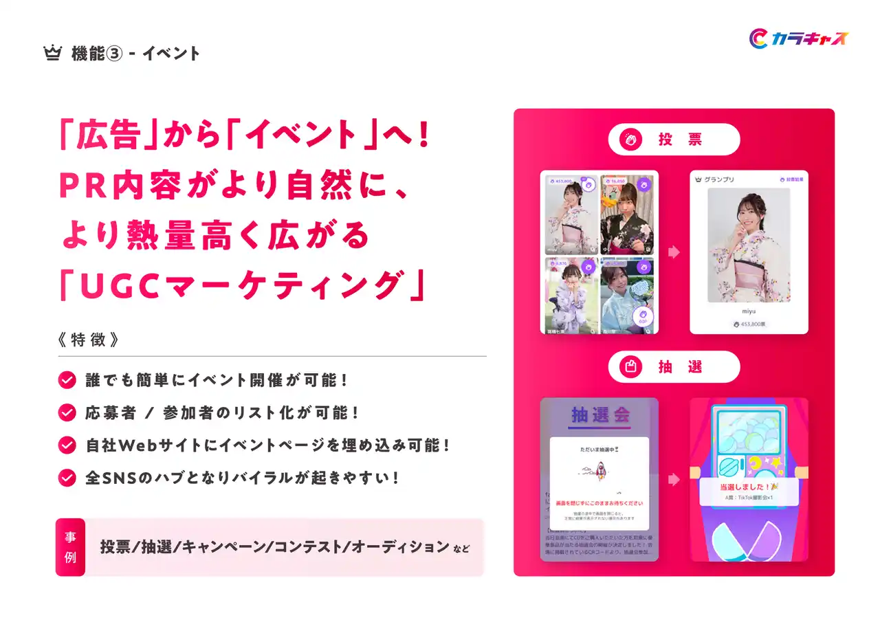| 投票イベント/抽選イベント/インスタントウィンなど、あらゆるイベントが可能に。 | |||