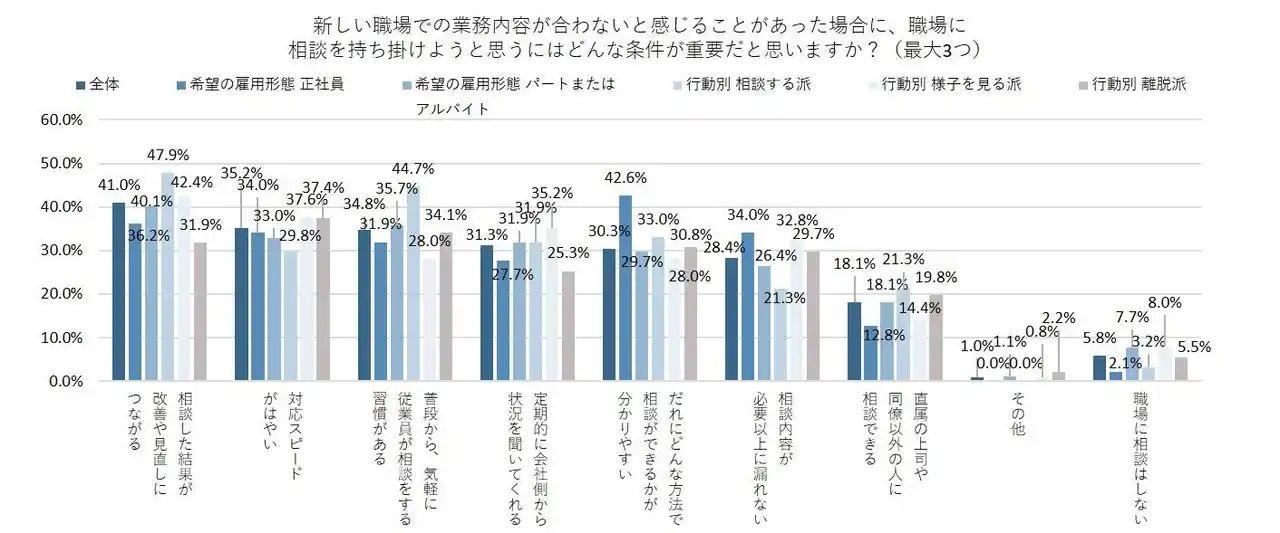 前項目の<業務内容が合わないと感じることがあった場合にどんな行動に移るか>で「社内のだれかに相談する」と「社外のだれかに相談する」を‟相談する派”、「仕事量や姿勢は変えず、様子を見る」を‟様子を見る派”、「仕事量や努力を抑えて、最小限の関与に留めるようにする」と「退職や転職活動に向けて動く」を‟離脱派”として集計した。‟相談する派”では「相談した結果が改善や見直しにつながる」と「普段から、気軽に従業員が相談をする習慣がある」が全体より高くなった。‟様子を見る派”では、「定期的に会社側から状況を聞いてくれる」が全体より高かった。‟離脱派”では、「対応スピードがはやい」が最も回答を集めた一方、「相談した結果が改善や見直しにつながる」が全体より低くなった。 |