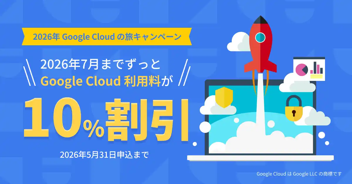 | 2026年5月31日までに「C-Chorus Google Cloud 請求代行サービス」へ初めてお申し込みいただくお客様を対象に、2026年7月31日までの Google Cloud の利用料金を10%割引でご提供します。 | |||