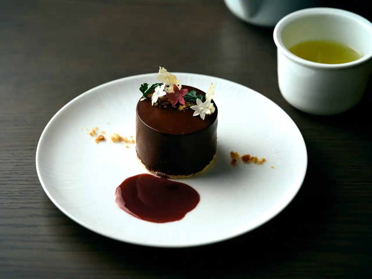 東京ミッドタウン日比谷1Fにある和スイーツと日本各地の魅力を楽しむカフェラウンジ「LEXUS MEETS...」は、期間限定メニュー「トヨタ×道セレクション」として、滋賀県高島市とコラボレーションした「アドベリーのチョコガナッシュと酒粕ムースのケーキ」のご提供を2026年4月17日(金)より開始いたします。 |