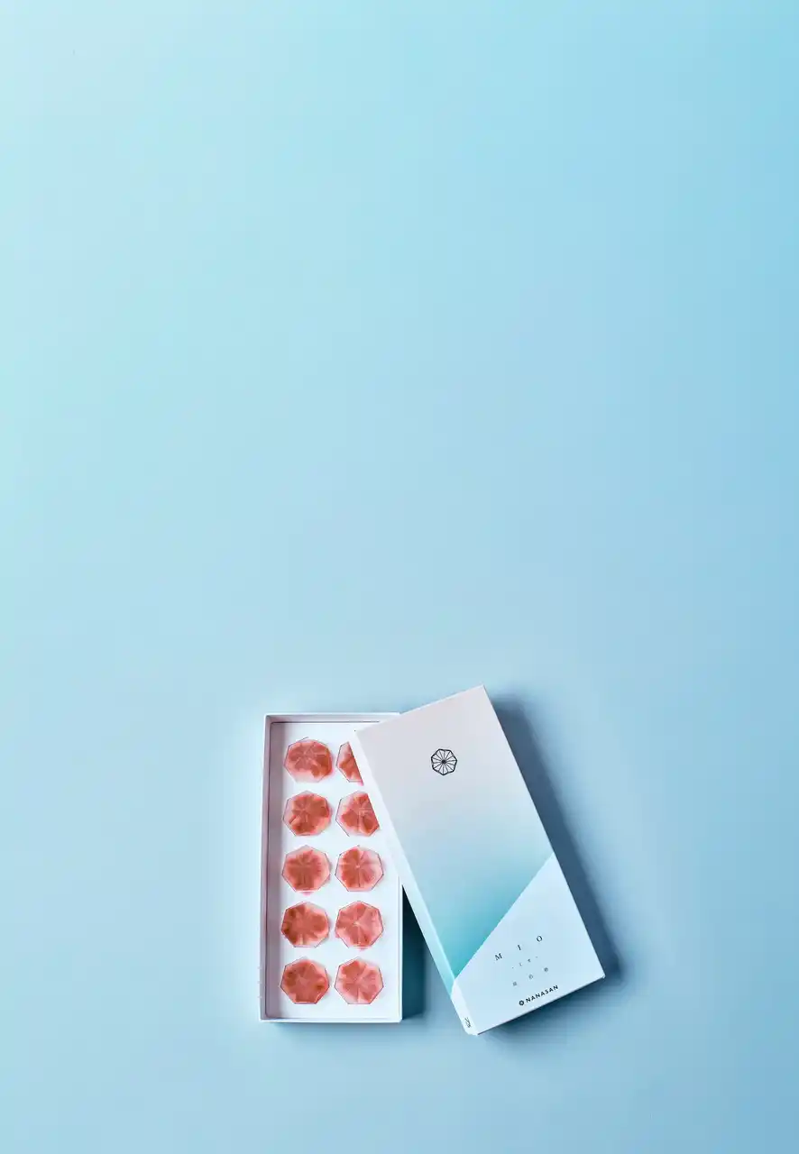三つの食感が楽しめるアドベリー味の琥珀糖。琥珀糖の特長である外側のシャリっとした口当たりと中のとろみに加え、もちっとしたゼリーを閉じ込めています。七角形の多面体にすることで表面積を高め、より一層シャリっとした心地よい食感が特長。 |