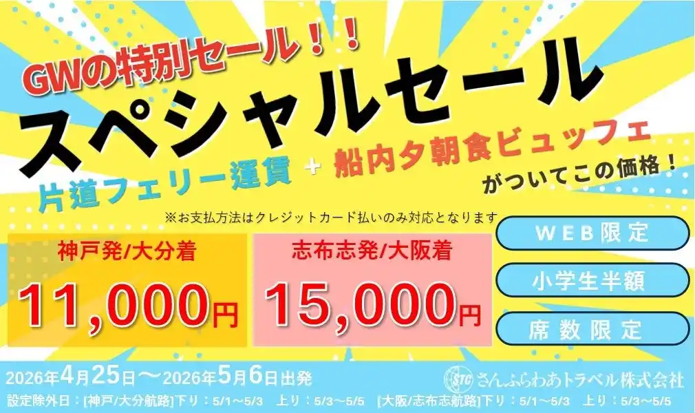 さんふらわあトラベル株式会社(社長:大西 康人、本社:大阪府大阪市住之江区)は、4月13日(月)10:00からゴールデンウィーク期間の「さんふらわあスペシャルセール」を販売いたします。 |