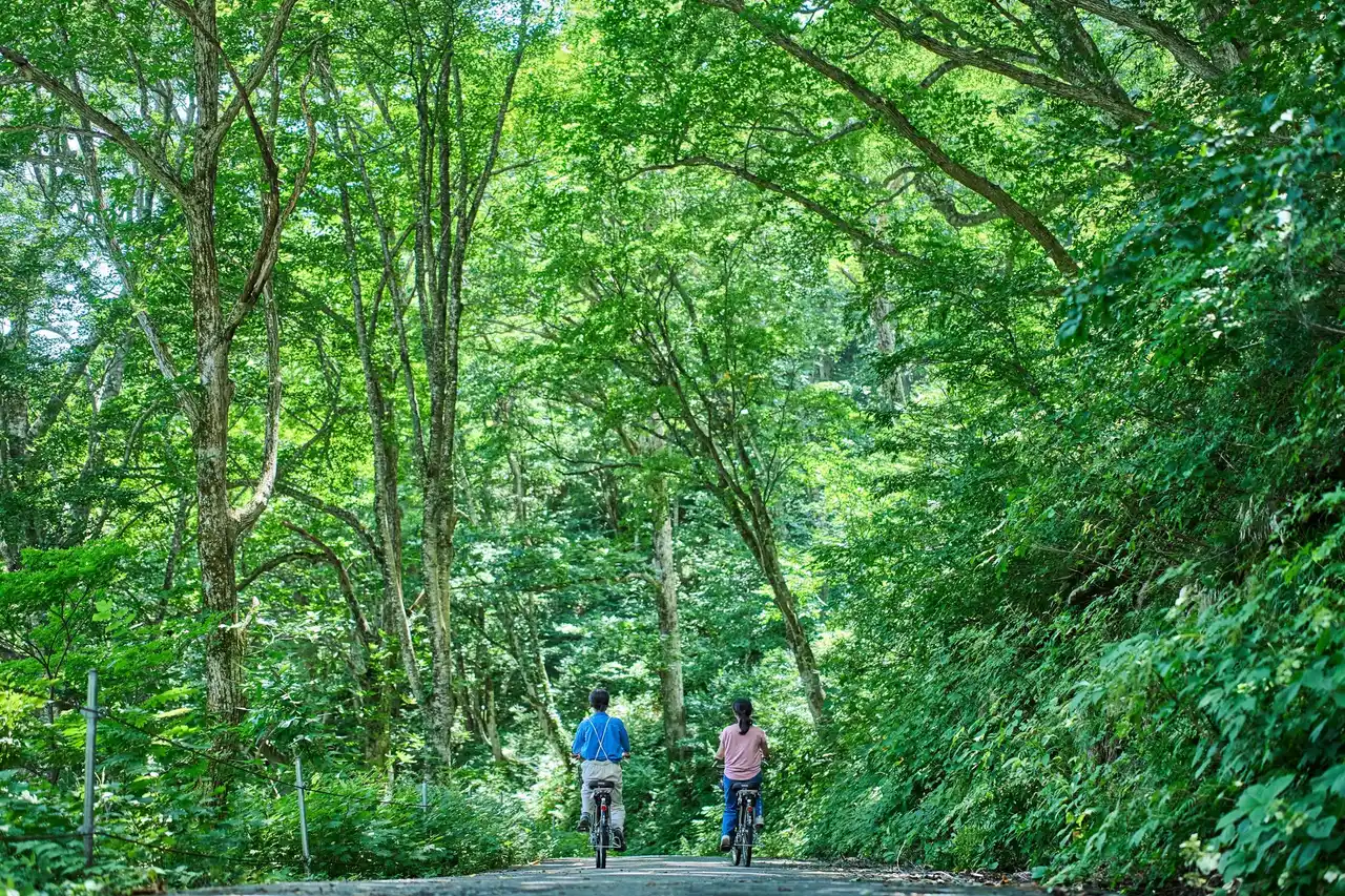 3 道中も涼しい、ブナの木漏れ日と風穴(ふうけつ)を感じるサイクリング |
