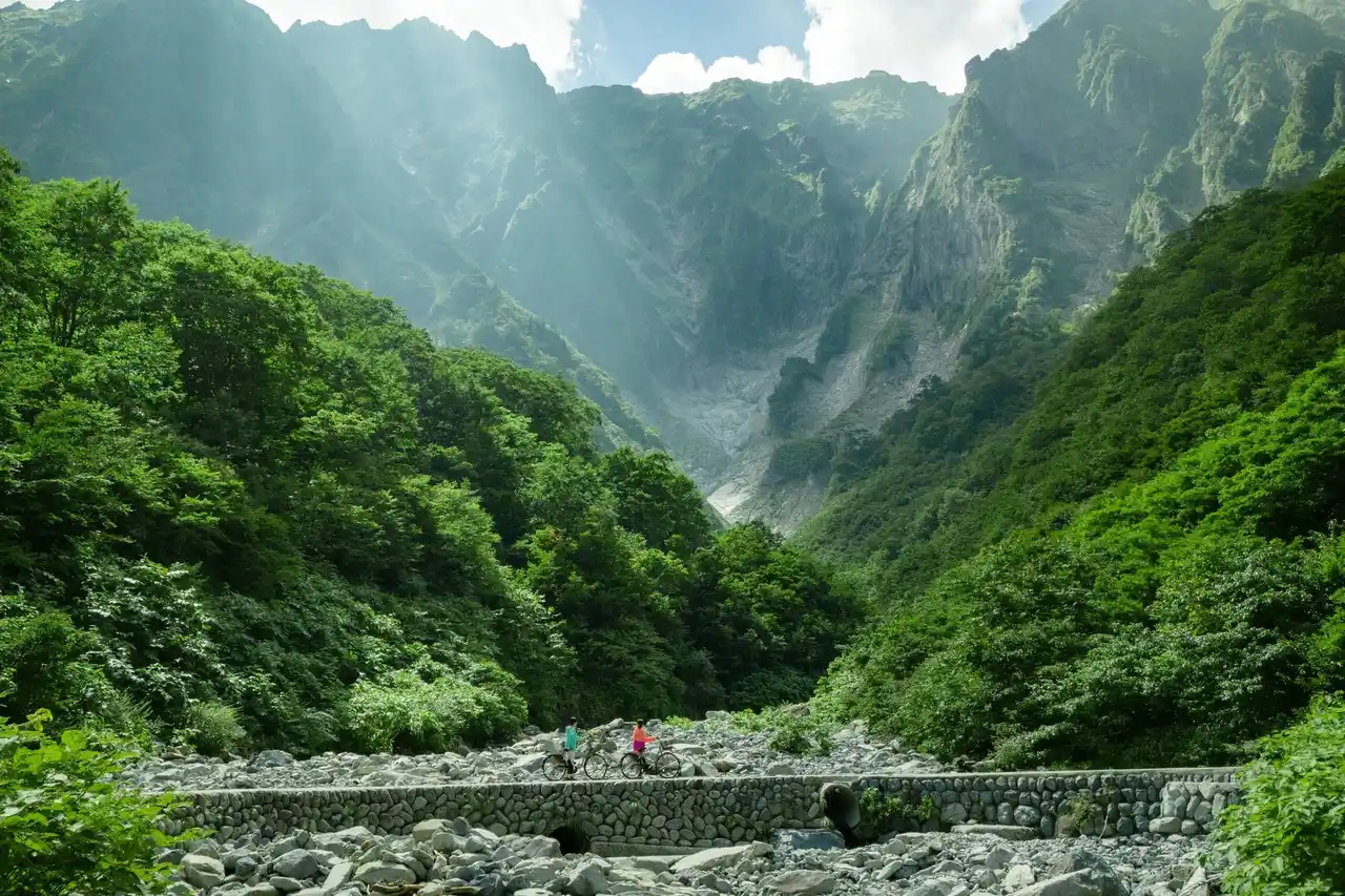足水を行う一ノ倉沢までは舗装された約3kmの平坦な道路が通っており、電動アシスト付きの自転車で道中も快適に走行可能です。自然環境保護などの理由からマイカー規制がされており、ブナやサワグルミの木立の中を、森林浴を楽しみながら進みます。道の途中には「風穴」という、地下の岩の隙間で冷やされた空気が吹き出している場所が点在しています。都会の猛暑と喧騒から離れ、移動中も天然の冷気に触れられる贅沢なアクティビティです。 |