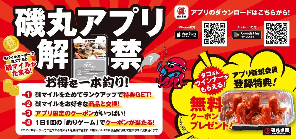 2026年2月にお得に楽しめる公式アプリをリリースしました! アプリ会員登録特典のタコさんウィンナー(5個)プレゼントに加え、次回の来店で「おつまみさきいか」もプレゼント! |