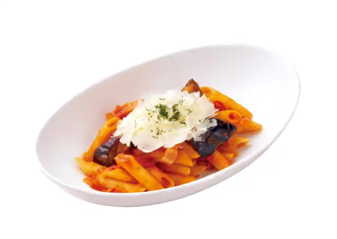 乱切りのなすとベーコン、そして薄削りのパルメザンチーズをトッピングし、麺はソースの絡みがよい生パスタのペンネを使用しています。時間が経ってもくっつかず美味しさそのままです。 |