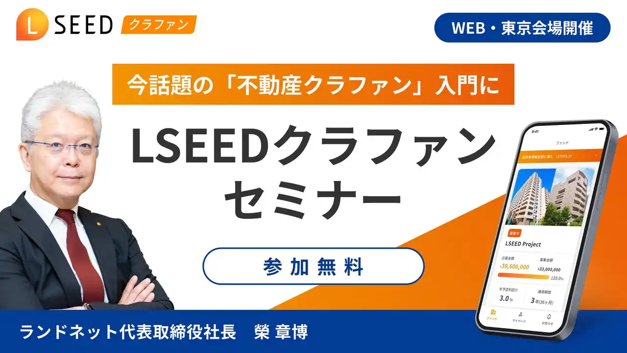 最新のテクノロジーと独自のデータベースを活用し、不動産の流通・再生・運用に新たな価値を提供する株式会社ランドネット(本社:東京都豊島区/代表取締役社長:榮 章博、証券コード:2991、以下当社)は、不動産クラウドファンディングについて学べる無料セミナーを開催いたします。本セミナーには代表取締役社長の榮 章博が登壇し、当社が提供する『LSEED(エルシード)クラファン』の仕組みからサービス内容、実績まで余すところなく徹底解説いたします。 |