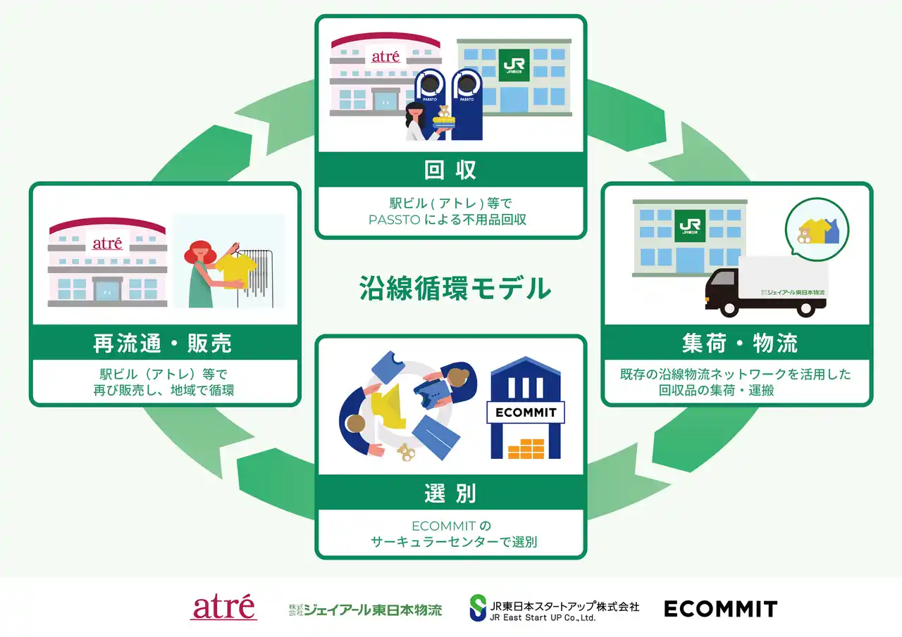 JR東日本スタートアップ株式会社(代表取締役社長:柴田裕、以下JR東日本スタートアップ)、株式会社ECOMMIT(代表取締役CEO:川野輝之、以下ECOMMIT)、株式会社アトレ(代表取締役社長:高橋弘行※、以下アトレ)、株式会社ジェイアール東日本物流(代表取締役社長:野口 忍、以下ジェイアール東日本物流)の4社が連携し、駅や駅ビルを起点とした資源循環モデルの実証実験を開始します。本取り組みでは、ECOMMITが提供する資源循環サービス「PASSTO(パスト)」を活用し、衣類や生活雑貨の回収および再流通を行い、地域における「持続可能な資源循環モデルの構築」を目的としたものです。 |