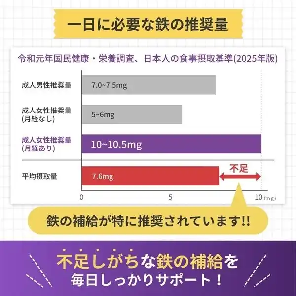 鉄分は体内に吸収されにくい栄養素のひとつでもあり、毎日の食事だけで推奨量を満たすことは容易ではありません。 |