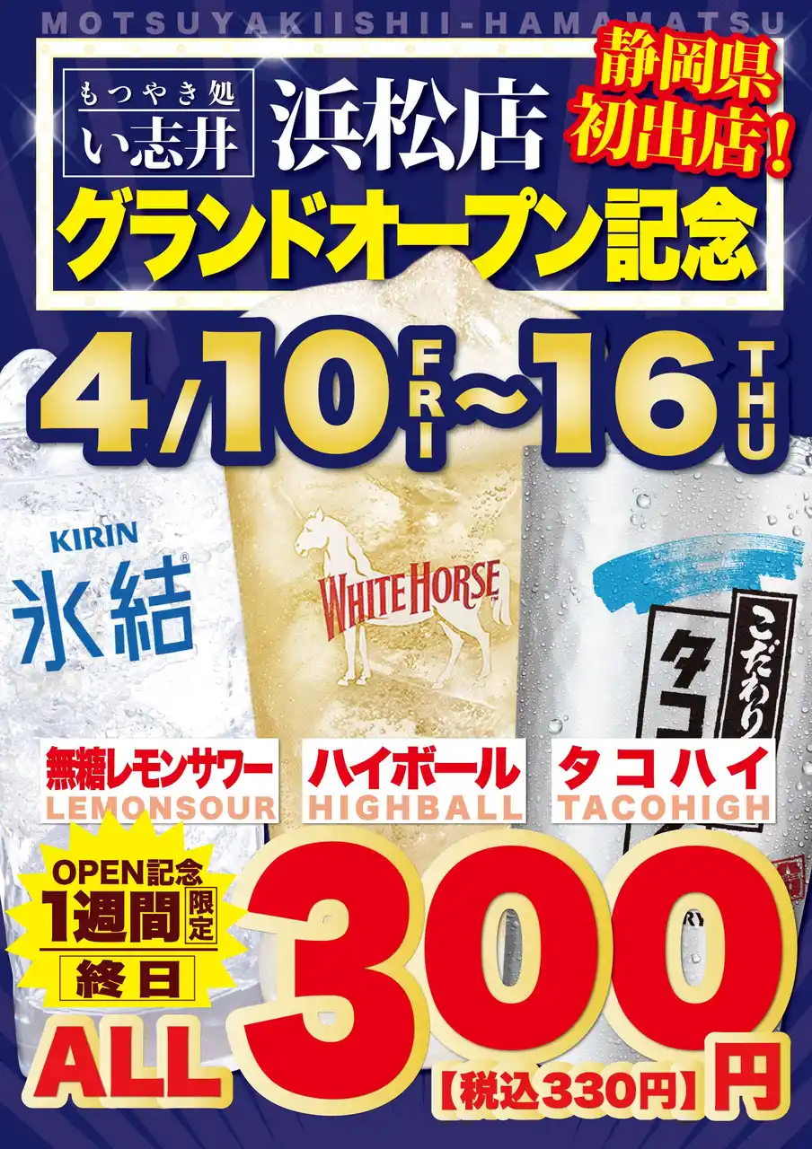 築地銀だこ を展開する 株式会社ホットランドホールディングス (本社:東京都中央区、代表取締役社長:佐瀬守男) の連結子会社で、 西日本における「築地銀だこ」や「大釜屋」等を展開する 株式会社ホットランド西日本 (本社:大阪府大阪市淀川区、代表取締役会長:荻野 哲)は、2026年4月10日(金)静岡県浜松市に『もつやき処 い志井 浜松店』 をオープンいたします。 |