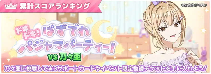 4月11日(土)12:00よりイベント「ドキドキ!ぱずでれパジャマパーティー!VS乃々亜」を開催します。当イベントでは、期間中の累計スコア順位に応じたランキング報酬が獲得可能です。またイベントステージで集めたポイントで、イベント限定のサポートカードやアイテムが獲得できる「ポイント交換所」も登場。繰り返し挑戦してよりたくさんのポイントを集め☆3サポートカードや勧誘チケットを手に入れよう! |