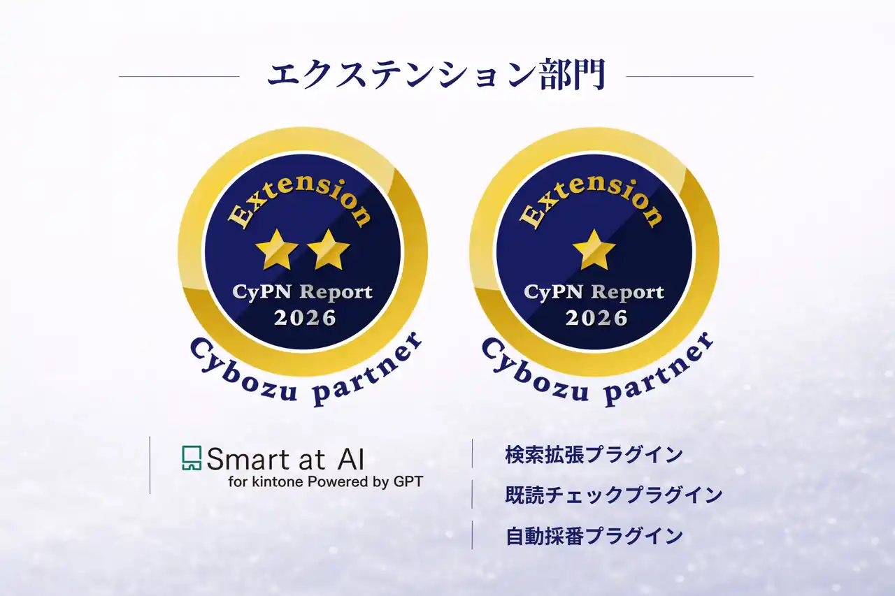 「CyPN Report 2026」は、サイボウズのオフィシャルパートナーの過去1年間の活動実績をもとに、サイボウズが高く評価したパートナーに星評価を付与する制度です。評価は事業領域ごとに5部門に分類され、顧客満足度、役務売上額、新規連携サービス導入数、製品顧客継続率、事例提供数など複数の指標で総合的に判断されます。M-SOLUTIONSはインテグレーション部門(開発・構築・コンサルティング・教育)にて最高評価となる三つ星を獲得いたしました。また、エクステンション部門(kintoneの拡張機能を提供するサービス)においては1製品で二つ星、3製品で一つ星を獲得しております。 |