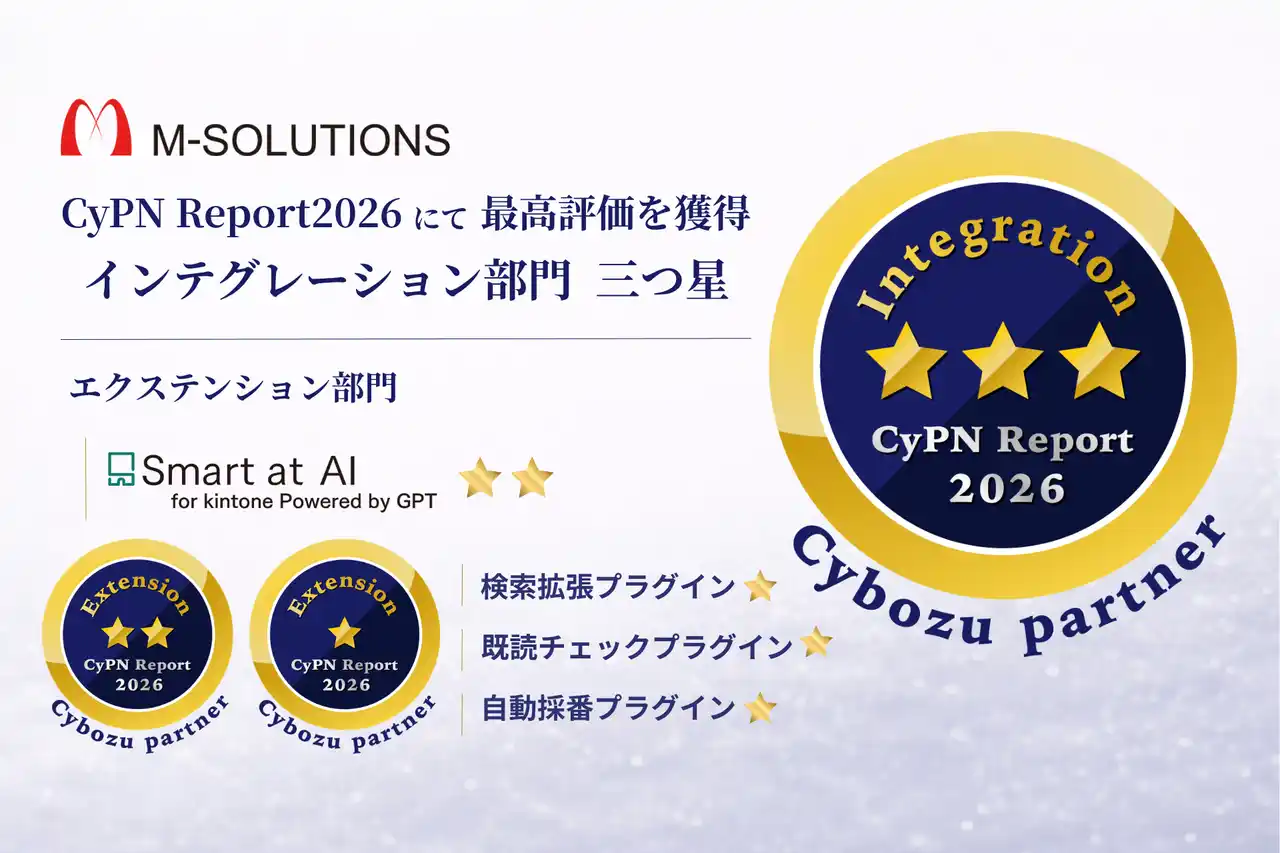 M-SOLUTIONS株式会社(本社:東京都豊島区、代表取締役社長CEO:植草 学、以下「M-SOLUTIONS」)は、サイボウズ株式会社(本社:東京都中央区、代表取締役社長:⻘野 慶久、以下サイボウズ)のオフィシャルパートナー評価制度である「Cybozu Partner Network Report 2026」(以下「CyPN Report 2026」)にて、インテグレーション部門で2年連続となる最高評価の三つ星を獲得したことをお知らせいたします。 |