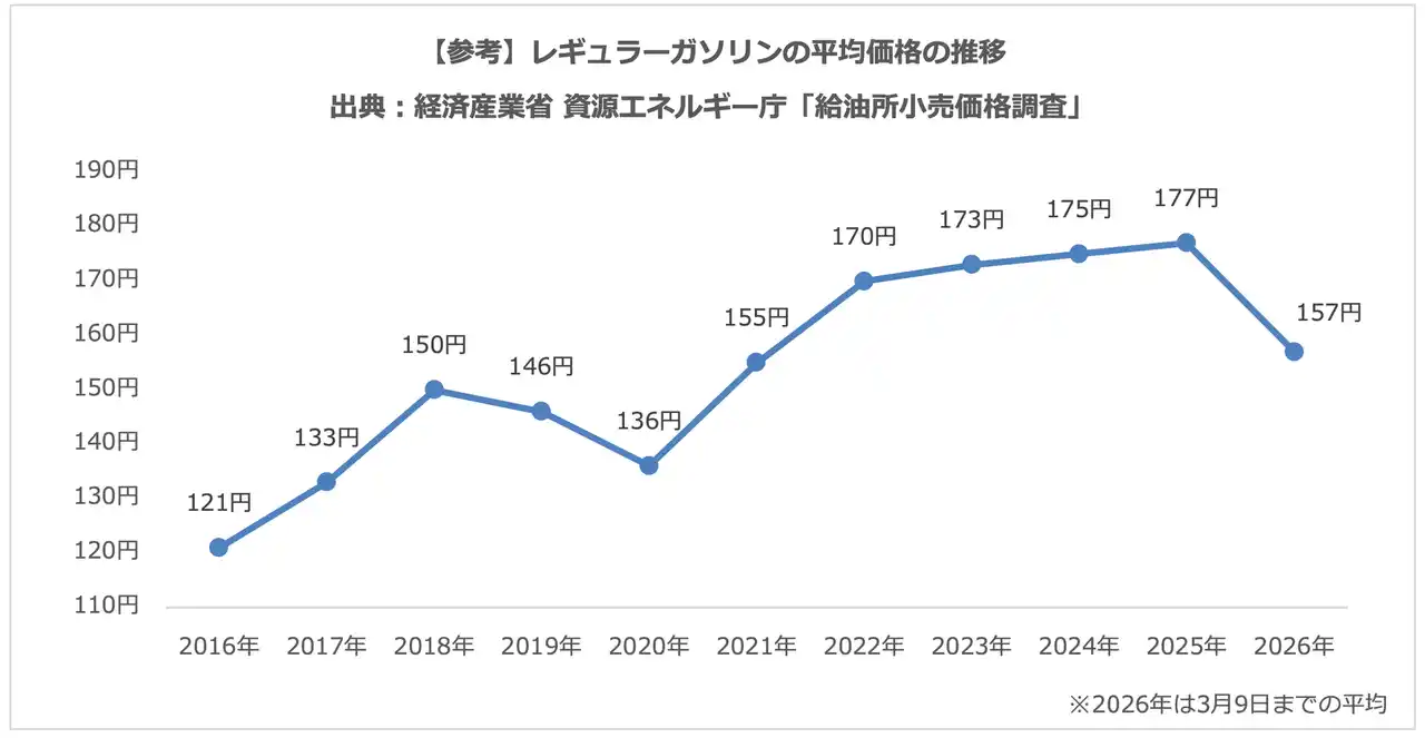 今回のアンケートでは、高いと感じるガソリン価格が近年上昇傾向にあったなかで、久しぶりに下がる結果となりました。しかし、世界情勢の変化を受けてガソリン価格は上昇基調となっています。 |