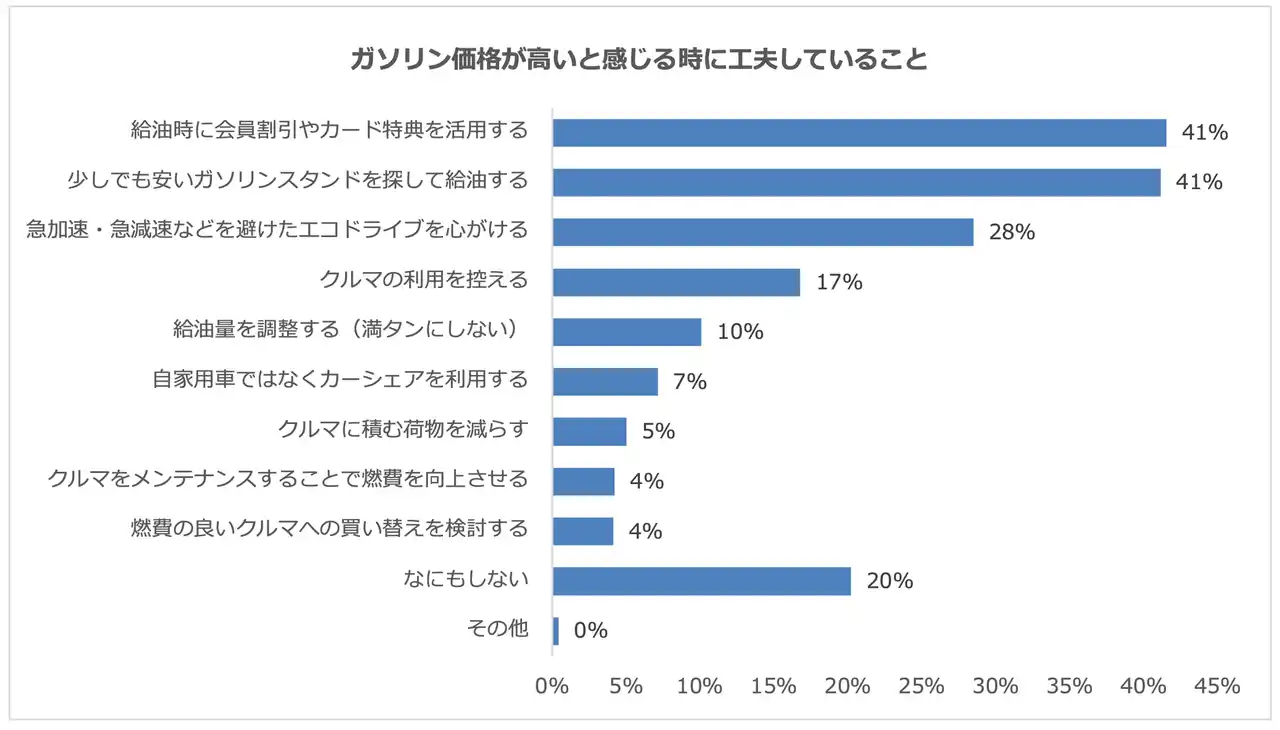 ガソリン価格が高いと感じる時に工夫していることを尋ねると、「給油時に会員割引やカード特典を活用する」「少しでも安いガソリンスタンドを探して給油する」がともに41%で最も多く、多くの人が給油料金の節約に取り組んでいることが分かりました。続いて、「急加速・急減速などを避けたエコドライブを心がける」28%となり、燃費改善による対策を取る人も一定数見られました。 |