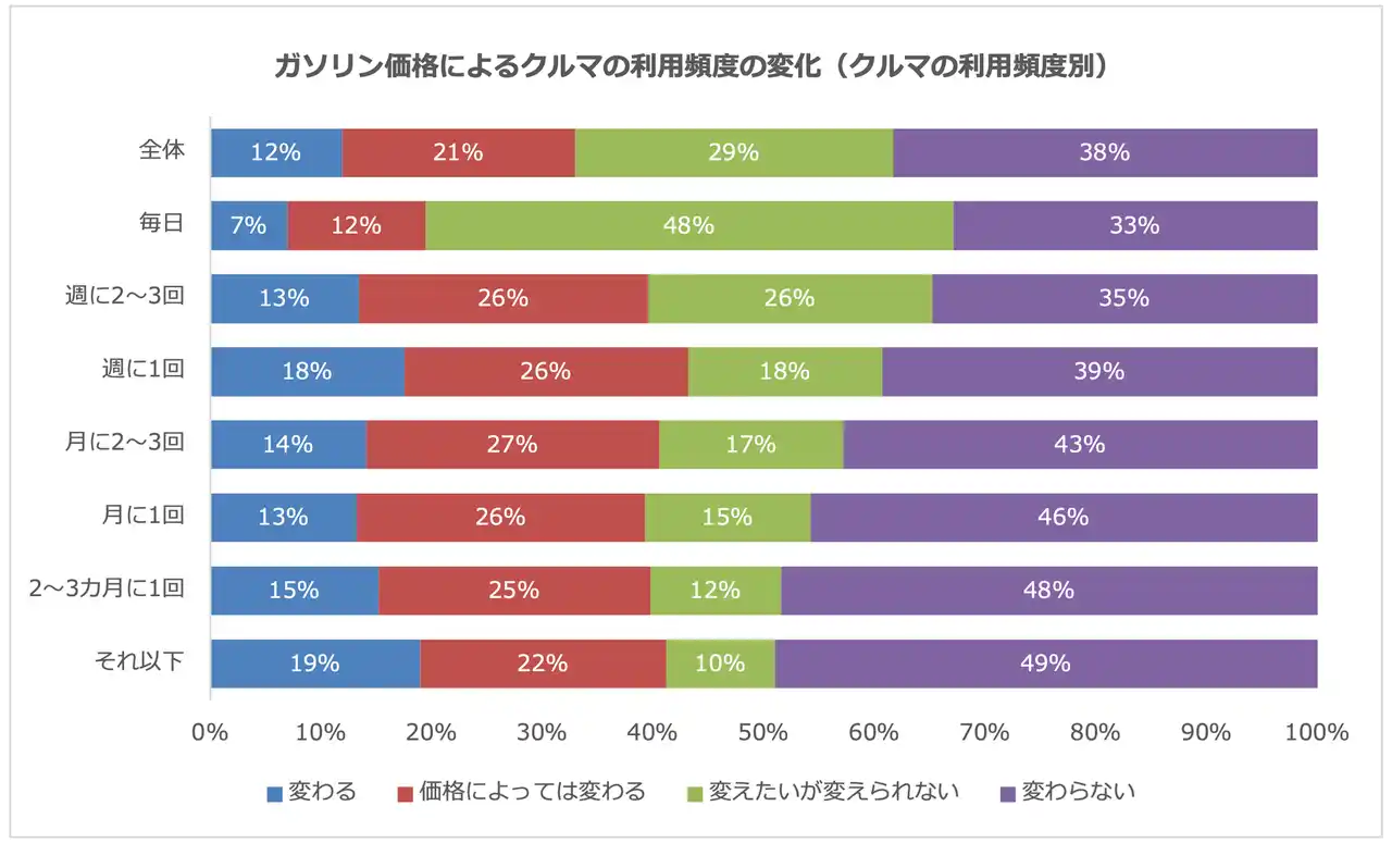 クルマの利用頻度がガソリン価格によって変わるかを尋ねたところ、「変わる」12%、「価格によっては変わる」21%、「変えたいが変えられない」29%、「変わらない」38%という結果となりました。利用頻度別に見ると、毎日クルマを利用する人は48%が「変えたいが変えられない」、33%が「変わらない」と回答している一方、月に1回以下の利用者では「変わらない」が約半数を占めました。 |