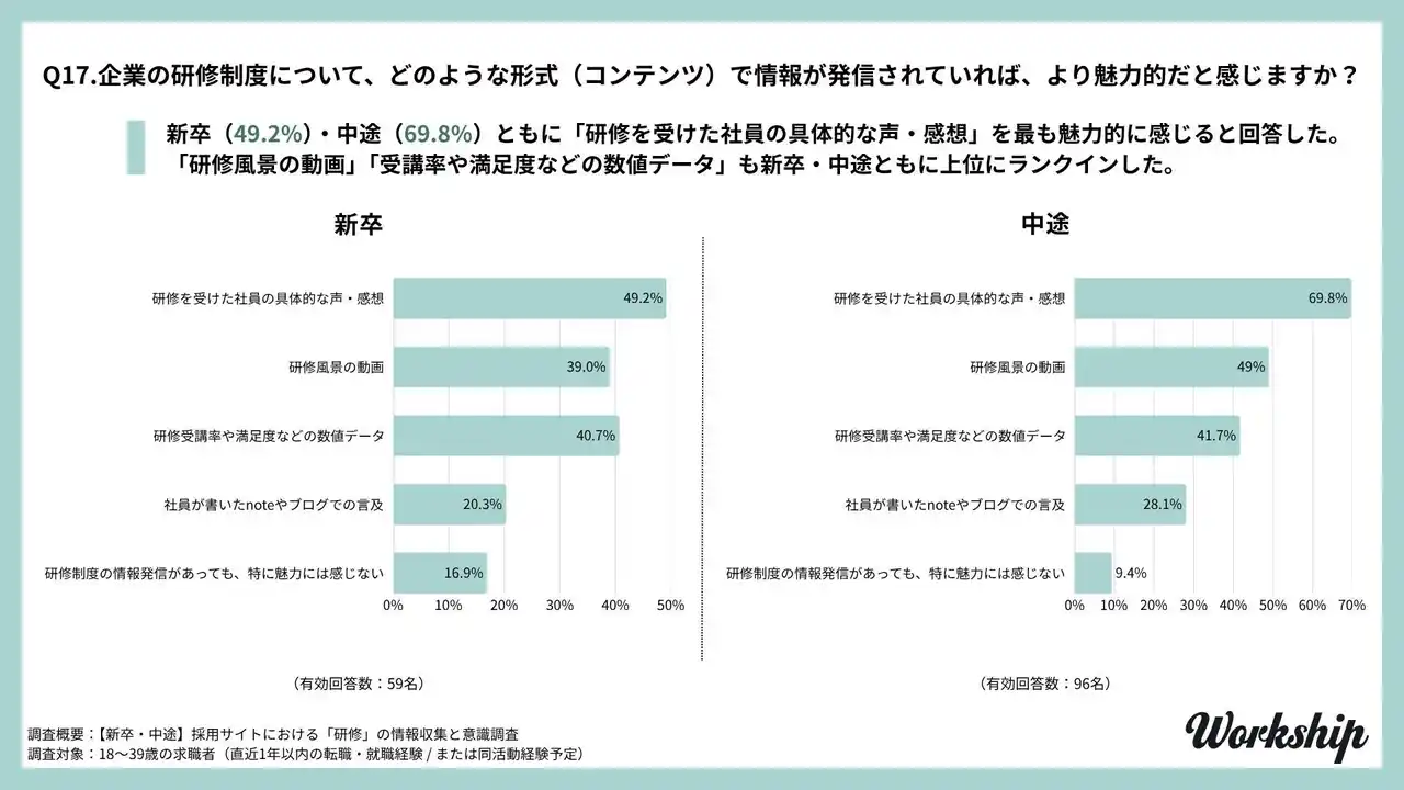 研修制度の魅力的な発信方法は、新卒・中途ともに「社員の生の声」が最多 |