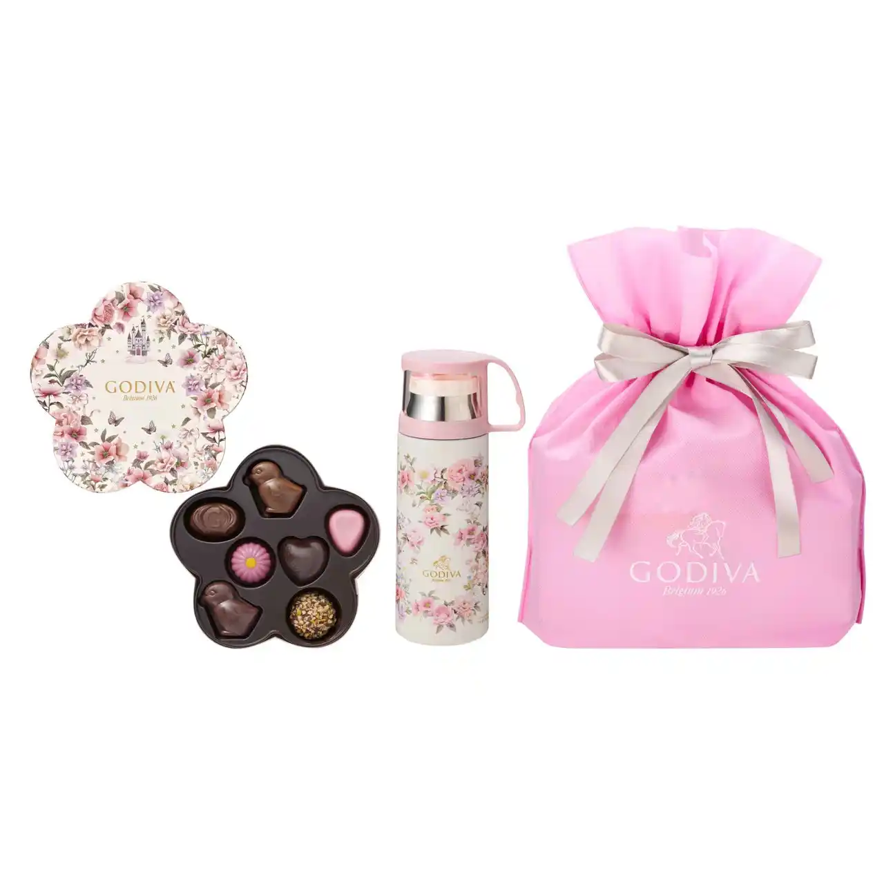 春らしい色とりどりの花を表現したフラワー形のパッケージの心躍るチョコレートの詰め合わせと、オリジナルデザインのステンレスボトルをセットに。 |