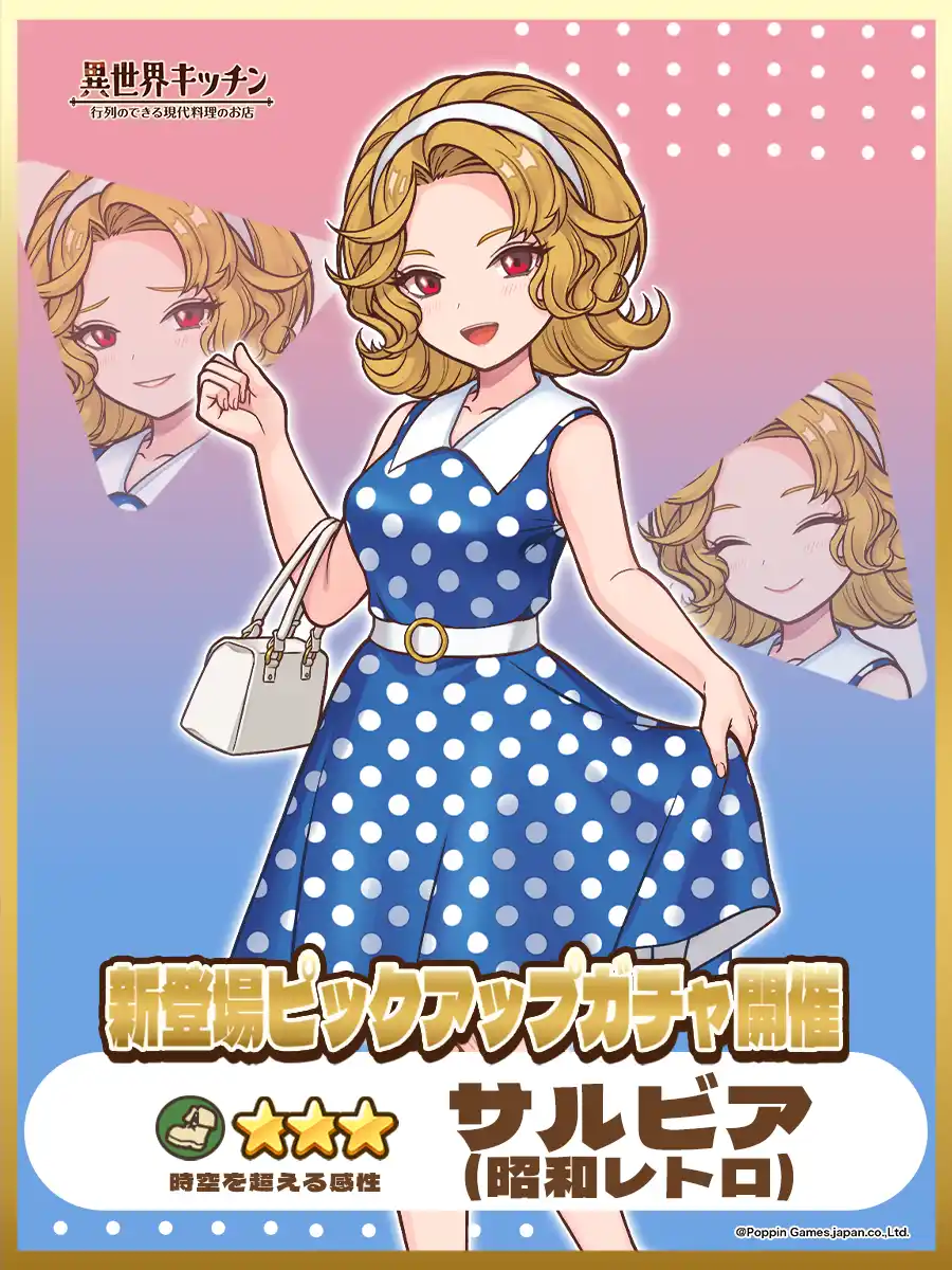 | スマートフォンゲーム『異世界キッチン 行列のできる現代料理のお店』は、★3サルビア(昭和レトロ)が登場&出現確率アップ!新登場ピックアップガチャを開催したことをお知らせいたします。 | |||