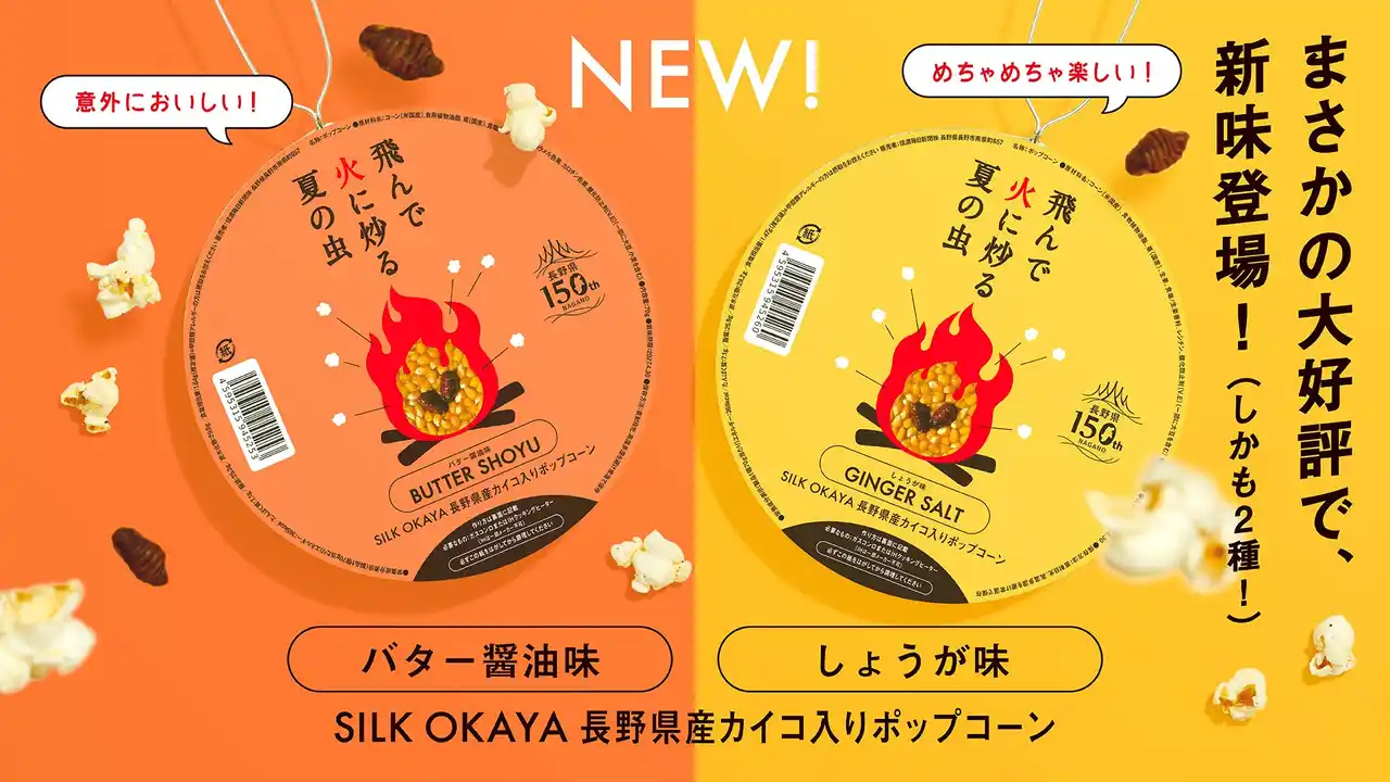 | 【完売続出】信州産「お蚕様」入りポップコーンに待望の新味!『飛んで火に炒る夏の虫』から「バター醤油味」「生姜味」が4月より新登場 |