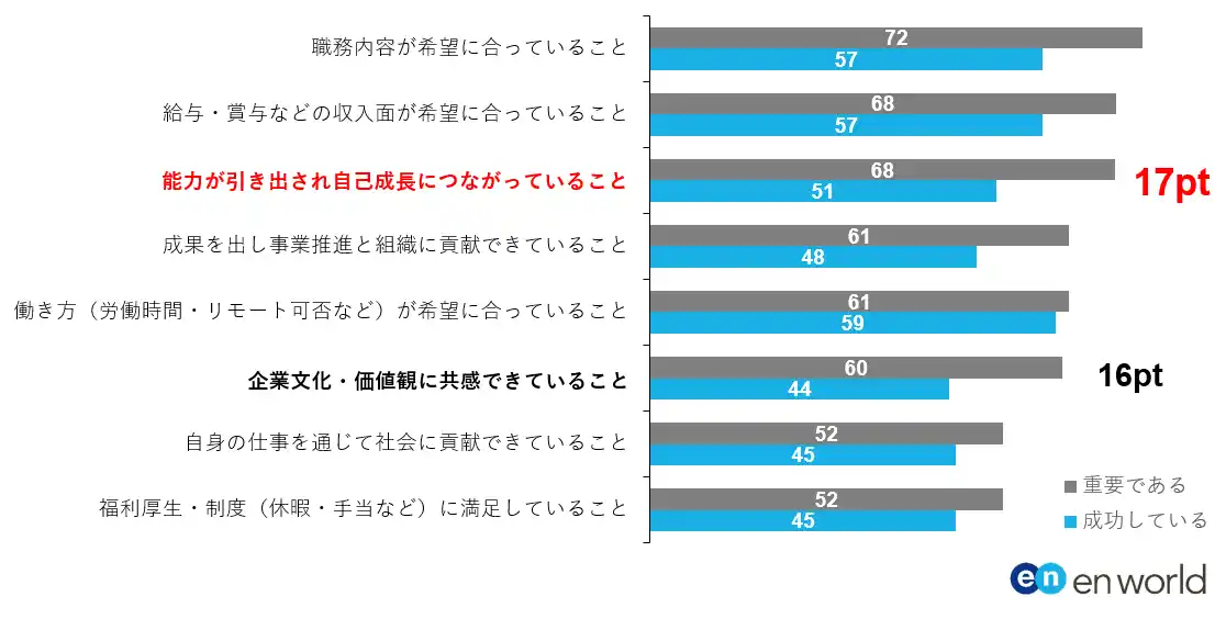 まず転職者側で、「成功している」と回答した割合が「重要である」と回答した割合を大きく下回ったのは、「能力が引き出され、自己成長につながっていること」(17pt差)、次いで「企業文化・価値観に共感できていること」(16pt差)となりました。【図3】 |