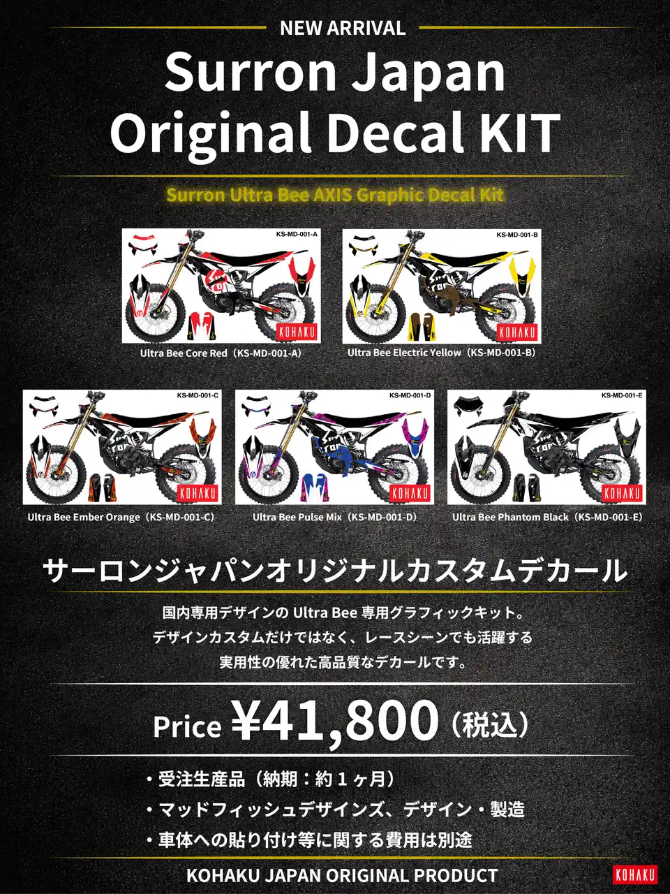 2026年4月- サーロンジャパン(輸入元:株式会社コハクジャパン/東京都葛飾区)は、電動オフロードバイク「Surron Ultra Bee」専用の日本限定カスタムデカールの受注販売を開始いたします。 |