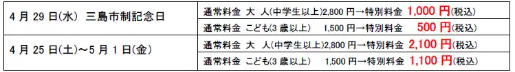 すっかり春らしくなり、日差しが心地いい季節になりました。そんな春のお出かけには、室内外で様々な温泉が楽しめるユネッサンがおすすめ!そこでユネッサンでは、三島市民の皆さまのお出掛け意欲を後押ししたいと考え、4月29日(水)の三島市制記念日に合わせて「勝手に三島市民割!」を実施いたします。 |