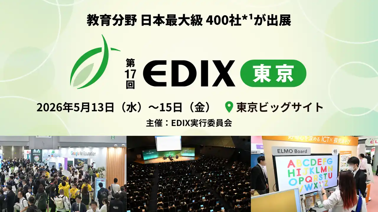 EDIX実行委員会(企画運営:RX Japan合同会社(本社:東京都中央区、代表執行役員社長:田中岳志))は、2026年5月13日(水)から15日(金)の3日間、東京ビッグサイトにて日本最大級の教育分野の総合展「第17回 EDIX(教育総合展)東京」を開催いたします。文部科学省、経済産業省、総務省、デジタル庁などからの後援を受け、教育現場が直面する課題解決につながる最新の製品・サービスが全国から集結します。 |