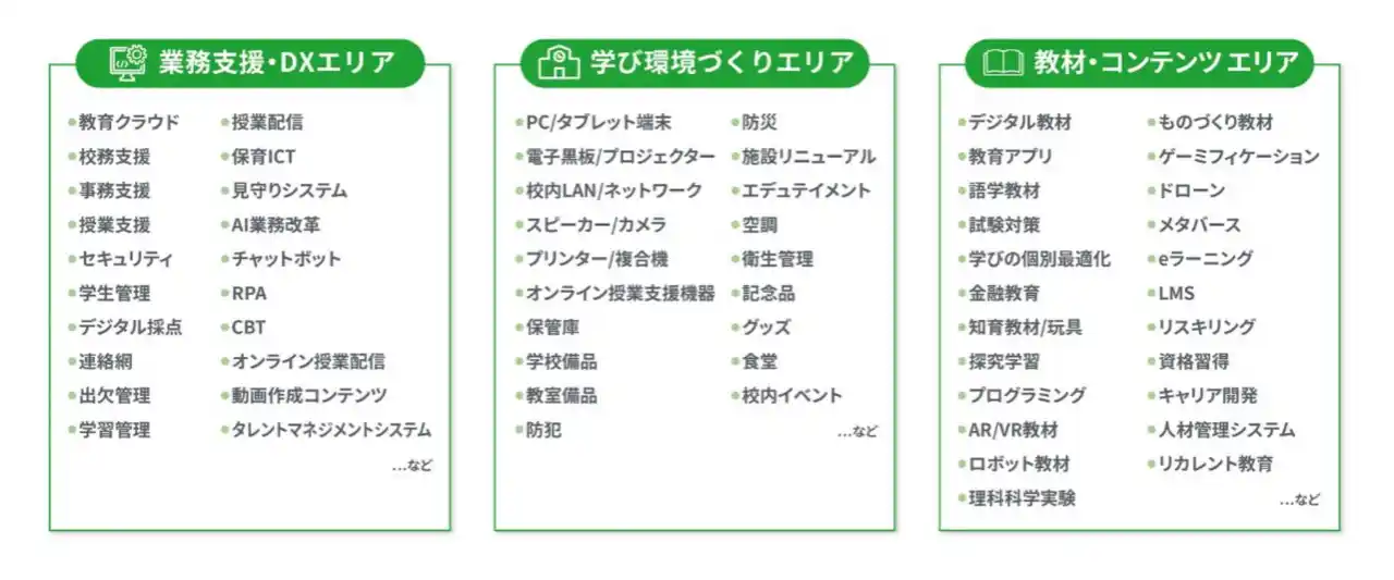 本展は、来場者の目的や課題に応じて情報収集・比較検討がしやすい 3つのエリア で構成され、教育現場の“今”と“これから”に必要な製品・サービスを一度に比較・体験することができます。 |