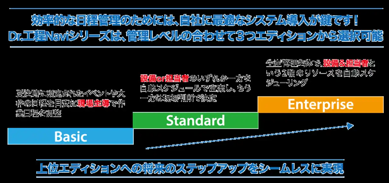「Dr.工程Navi」シリーズは、生産現場が求める管理レベルに合わせてシステム導入が可能な製品群を提供いたします。また、管理レベルの変化に合わせて容易にレベルップが可能となるようシステム基盤の共通化を図っております。 |