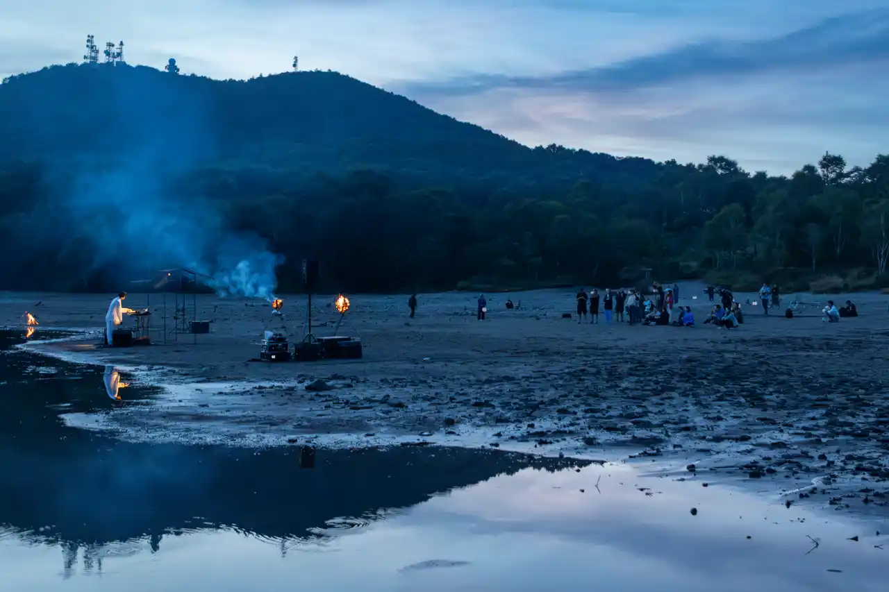 | 2025年、冥丁は赤城山の山頂に位置する火口湖「小沼」で演奏を行いました。水神が 宿る 神域とされてきた小沼では、当時、水位が急激に低下し、数ヶ月で半分以下にまで減少する異変が起きていました。その状況を受けて行われたのが、「雨乞い」としての奉納演奏です。松明の音だけが響く空間で「自分がどこにいるのかわからない」という感覚の中に立つ時間は、音楽を志した原初の記憶と重なるものでした。この体験は、“幽微なもの”をつくり続けることへの確信を与えたと冥丁は語ります。 | ||||||||||||||||||||||