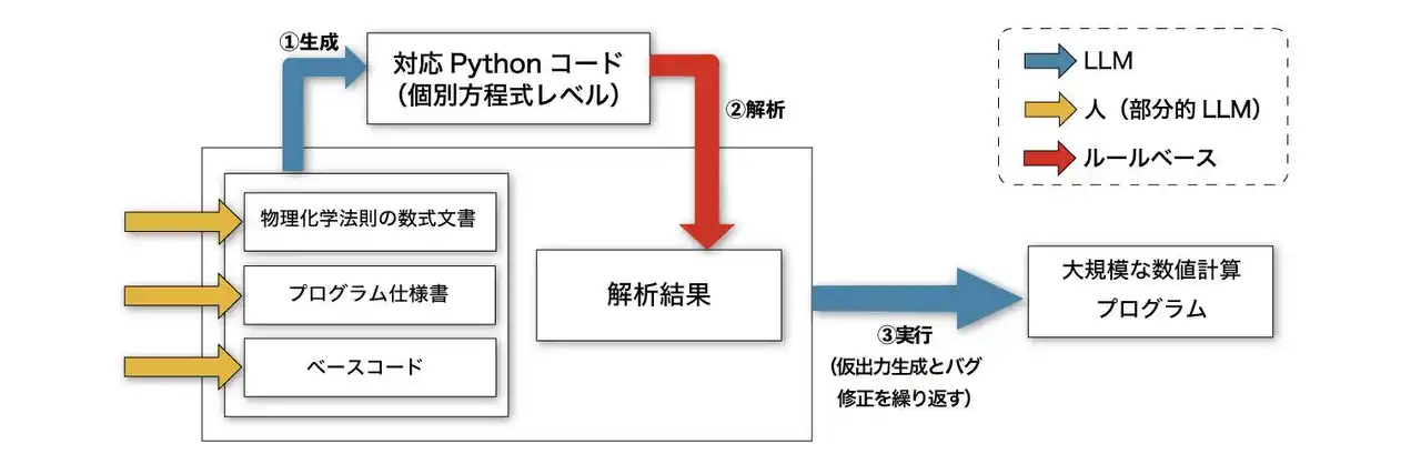 今回の検証では、数式、条件、制約を人間が理解可能な形式で文書化し、それらを生成AIに入力することで、大規模な数値計算プログラムを正しく生成できるかを評価しました。その結果、「守るべき開発ルール」や「手本となるベースコード」を適切に与えることで、生成AIが勝手な簡略化や誤解釈を行うことなく、正確なプログラムを生成できることを確認しました。そして、汎用的なコーディングエージェント※3がプログラム実装の大部分を担うことができ、人間の負担を従来の3分の1程度に大幅軽減できる見通しを得ました。これにより、開発者は理論や数式の検討、結果の解釈といった本質的な技術検討に、より注力できるようになります。 |