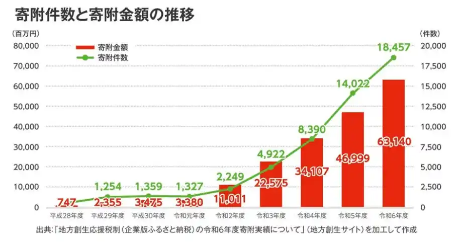 企業版ふるさと納税(正式名称:地方創生応援税制)は、国が認定した地方公共団体の地方創生プロジェクトに対して企業が寄附を行った場合に、法人関係税から税額控除される制度です。2024年度は寄附件数・寄附金額ともに過去最高の18,457件、631億40百万円を記録しており、制度の活用は年々増加しております。詳細はジチタイリンクの企業版ふるさと納税支援事業ホームページ(https://zaigenkakuho.com/kigyou_furusato/)をご参照ください。