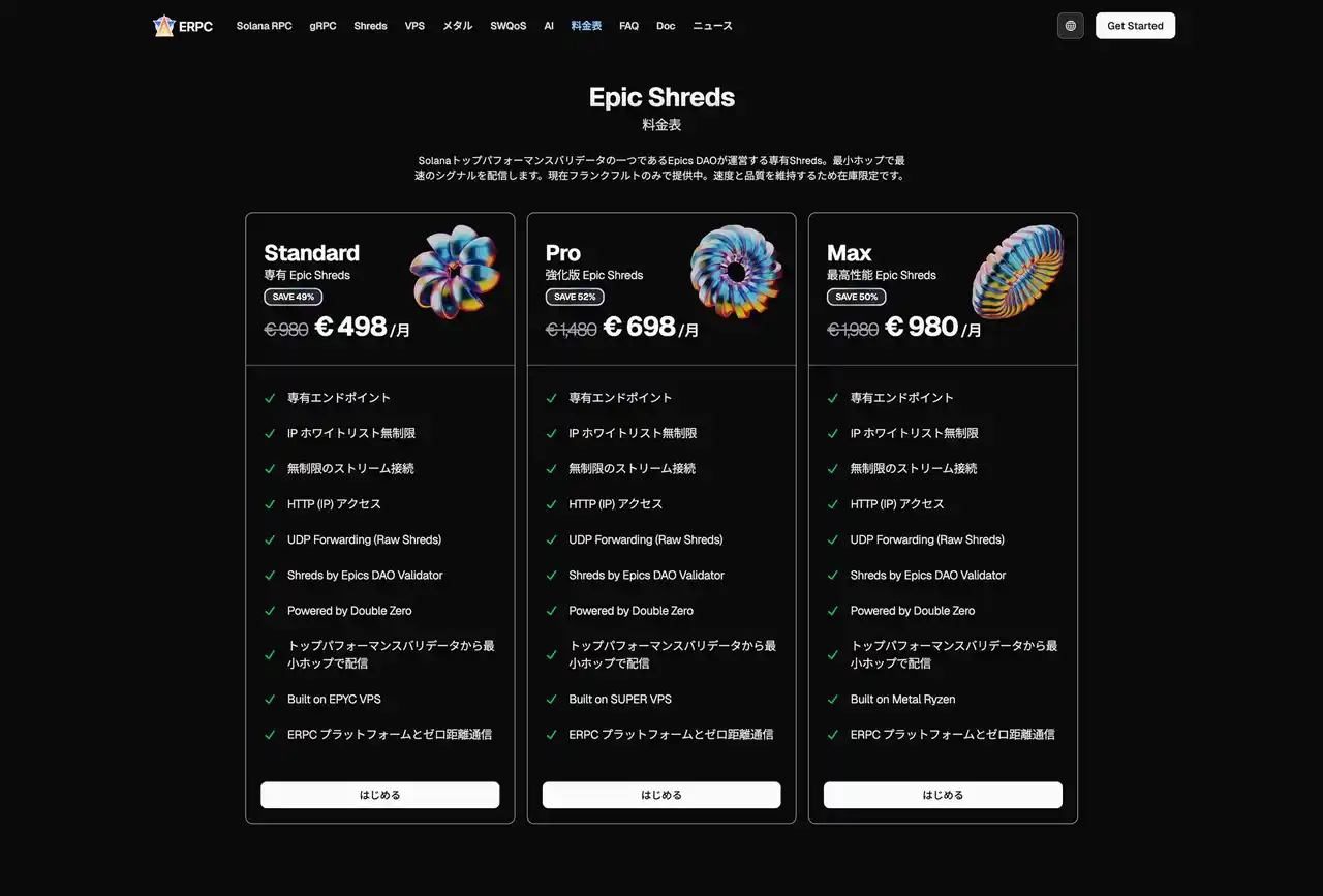 ERPC のインフラは、汎用サーバーホスティングではなく、Solana 特化で設計されています。ハードウェア選定、ネットワーク経路の最適化、OS レベルのチューニング、IRQ アフィニティの調整 - あらゆるレイヤーが Solana の要件に最適化されています。 |