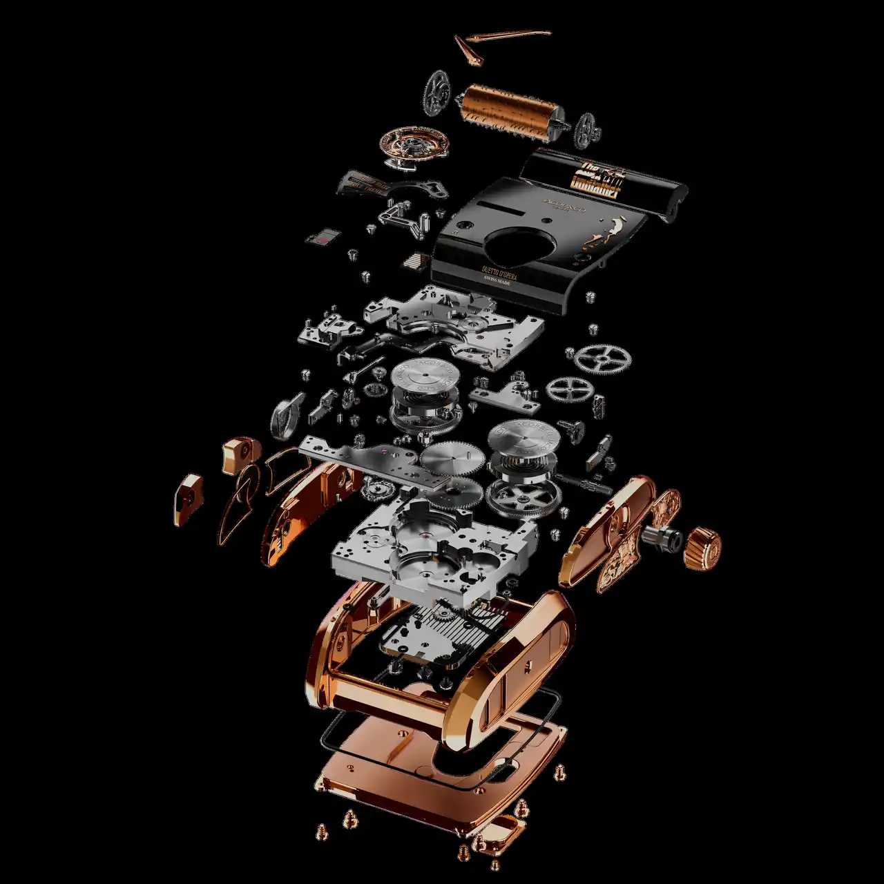 | この機構は、ごくわずかな可動域によって旋律を切り替える高度な構造を備えており、ひとつのシステムの中で異なる楽曲をシームレスに奏でることを可能にしています。音響機構と時計機構が別々に存在するのではなく、ひとつの統合されたアーキテクチャとして成立している点に、「ザ ゴッドファーザーII」の本質があります。 | ||||||||||||