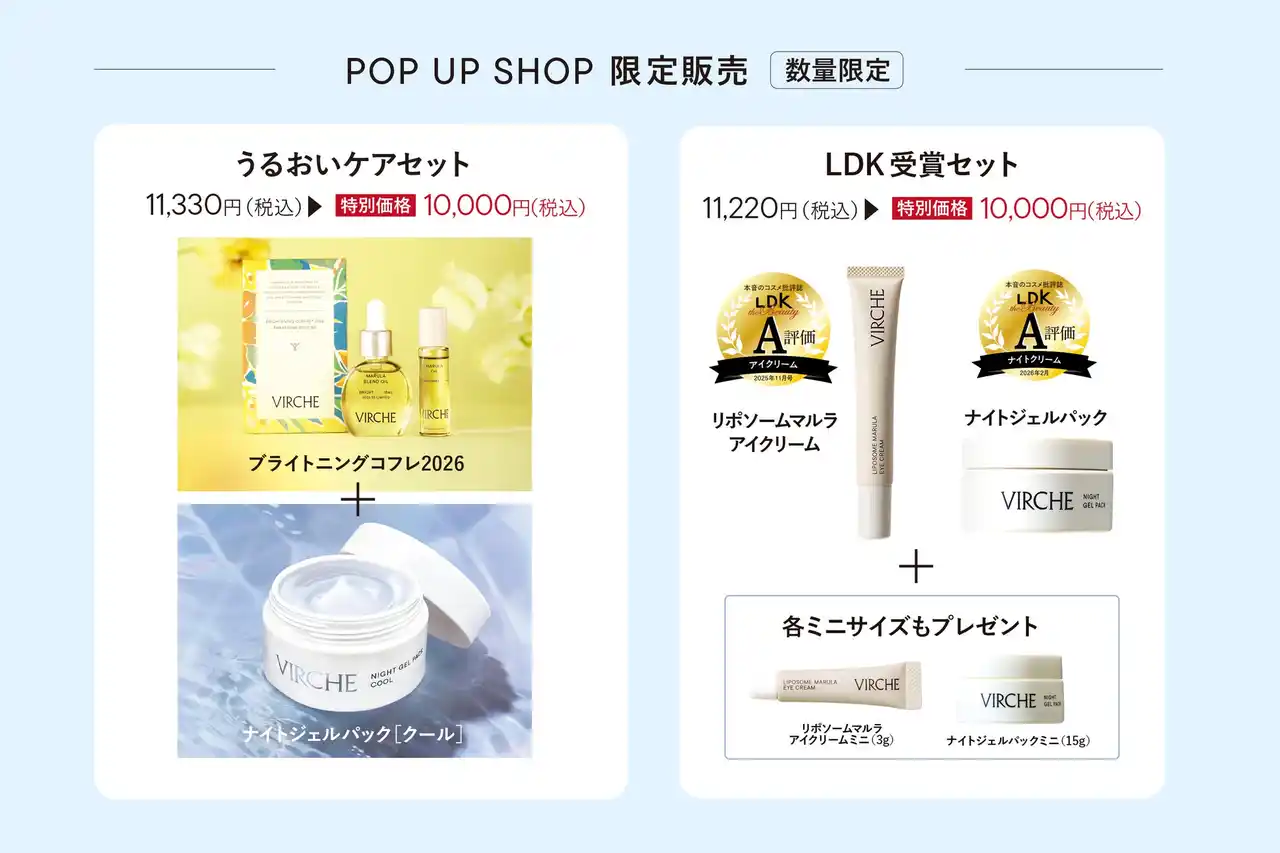 | 数量限定発売の「ブライトニングコフレ2026」と「ナイトジェルパック[クール]」がセットになった「うるおいケアセット」と、LDK the BeautyでA評価を受賞した「リポソームマルラアイクリーム」と「ナイトジェルパック[クール]」がセットになった「LDK受賞セット」の2種を今回のPOP UP SHOP限定で販売します。 | |||||||||||||