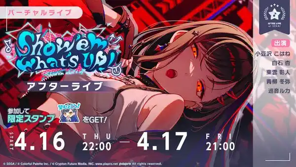 イベント終了後には「バーチャルライブ」でのアフターライブとして、「Show ‘em what’s up! アフターライブ」を開催いたします。 |