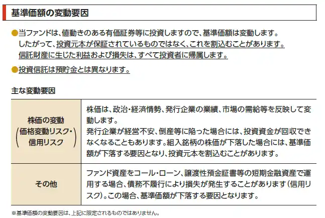 投資信託は値動きのある有価証券等に投資しますので、基準価額は大きく変動します。したがって、投資元本が保証されているものではありません。信託財産に生じた利益および損失はすべて投資者に帰属します。投資信託は預貯金とは異なります。 |