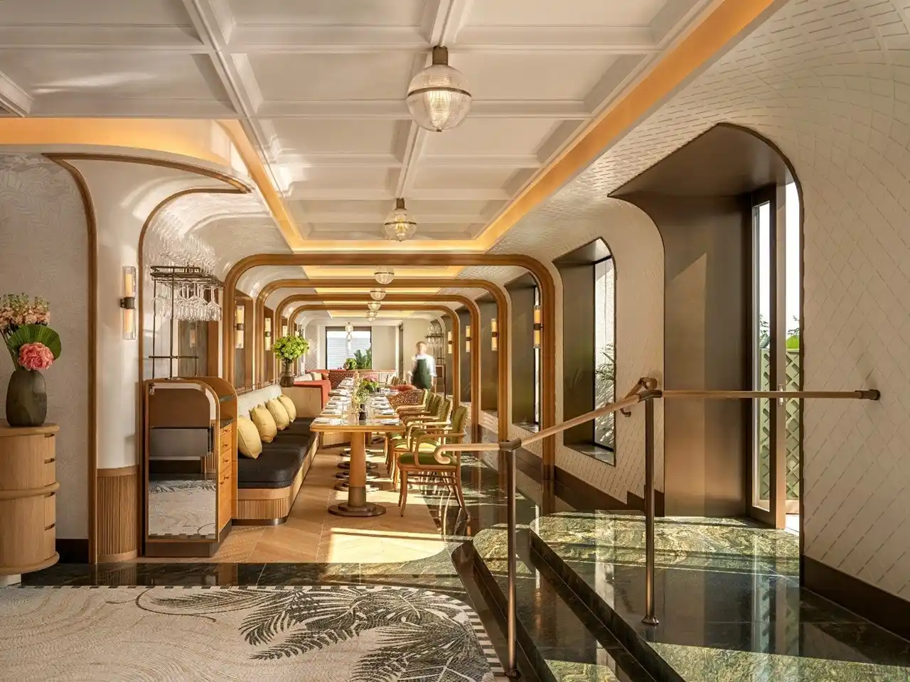 レストランの内装は、パリに拠点を構えるデザイン事務所、マルエルブ・パリ社が担当いたしました。フレンチ・ブラッスリーの黄金時代と豪華列車の旅をインスピレーションに、ブールー・シェフが繰り出すグローバルな観点に満ちたメニューを反映する、タイムレスな雰囲気が演出されています。ダイニングルームでは、曲線を描く木工細工、職人の手仕事が光る装飾、そして重層的な照明が、温かで没入感に溢れる空間を生み出しています。また、インテリアの各所に見られる地元の職人技と港湾都市・香港への繊細なオマージュが、レストラン全体を香港に根ざした空間として印象づけています。 |