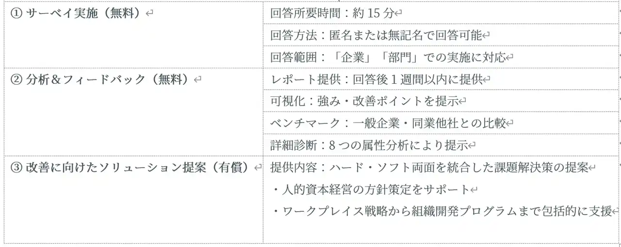 シービーアールイー株式会社(本社・東京都千代田区、代表取締役社長 兼 COO 辻貴史、以下CBRE)は4月9日、企業の人的資本経営を総合的に支援する新サービス「人的資本経営コンサルティング」を開始したことを発表しました。本サービスは、オフィス環境などの物理的な“ハード”と、組織開発・人材マネジメントといった“ソフト”を一体的に設計し、企業が持続的に成長するための変革を多面的に支援するものです。また、サービス開始に合わせ、組織の現状を短時間で可視化できる無料診断サービス「組織診断パルスサーベイ」の提供も開始します。 |