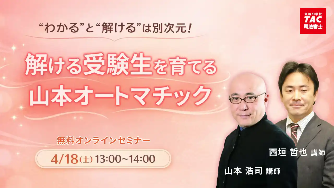 本セミナーでは、必要十分な知識だけで合格を目指す「山本オートマチック」のコースを徹底解説します。セミナー後半では質疑応答の時間も設けますので、学習に関する疑問や不安を解消しましょう。 |