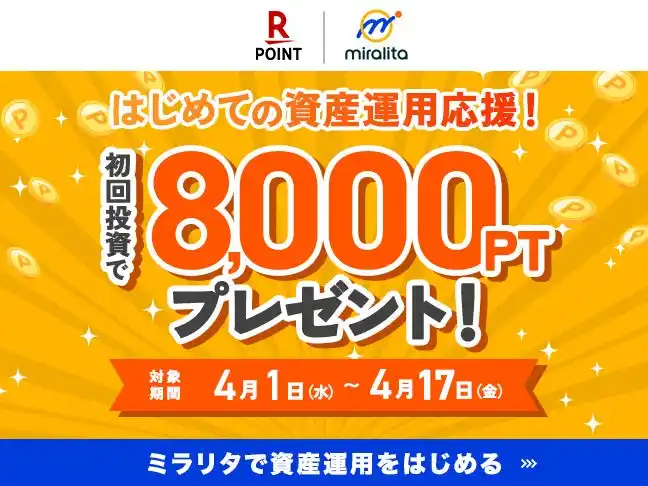 事業投資型クラウドファンディングプラットフォーム「ミラリタ」を運営するミラリタ株式会社(本社:東京都港区/代表取締役社長:重田恭宏)は、4月1日(水)より、対象期間中に「ミラリタ」にて初めての投資を完了された方を対象に、楽天ポイント8,000ポイントをプレゼントする「はじめての資産運用応援!新しい私を始める。初回投資キャンペーン~楽天ポイント8,000ptプレゼント~」を開催しております。 |