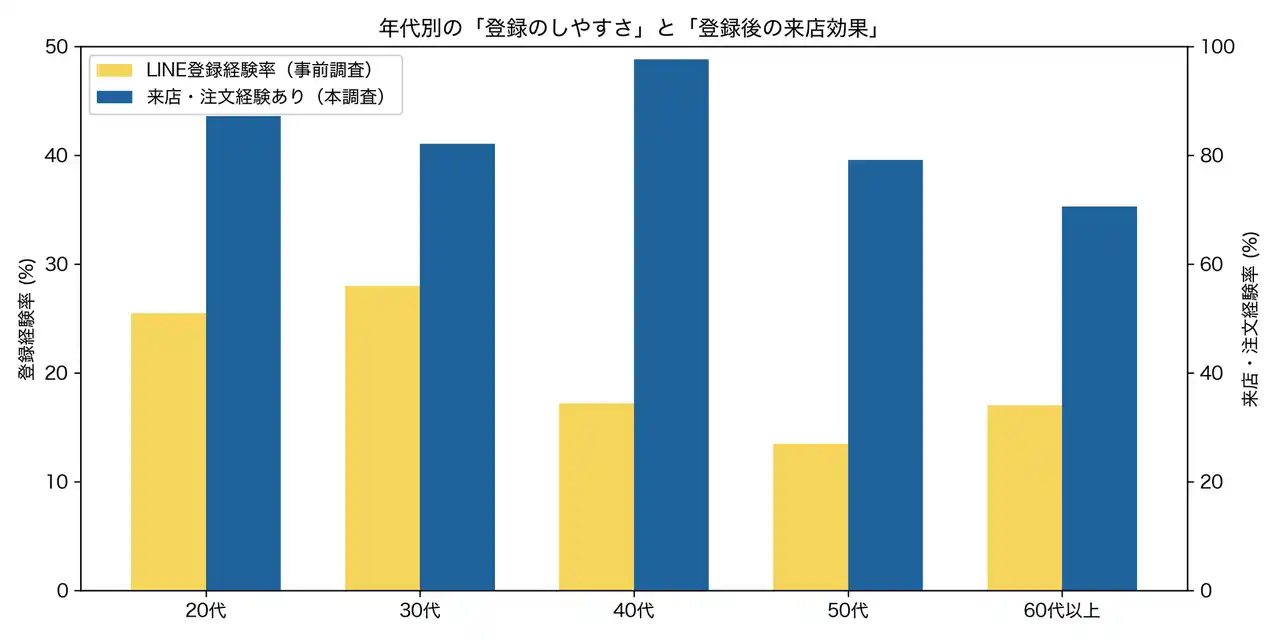 | この結果から、飲食店LINEは、30代では登録の入口として機能しやすく、40代では登録後の再来店導線として特に強く機能している可能性がうかがえます。年代によって、重視すべきポイントが異なることが示唆されます。 | |||||||||||||||||||||
