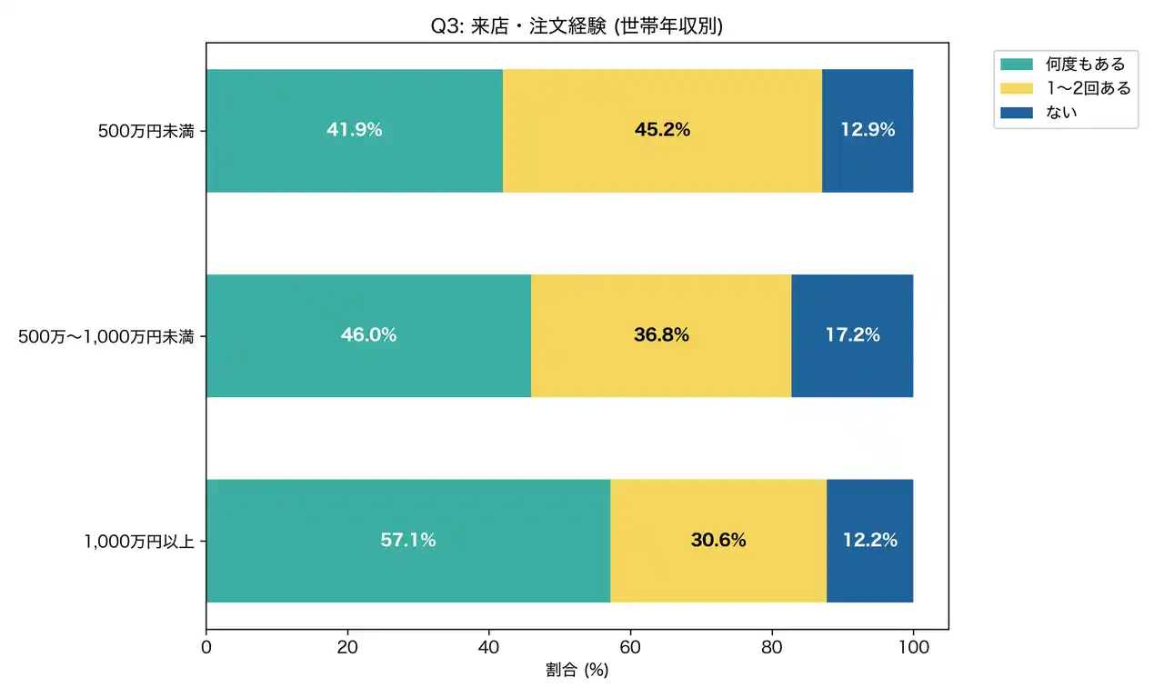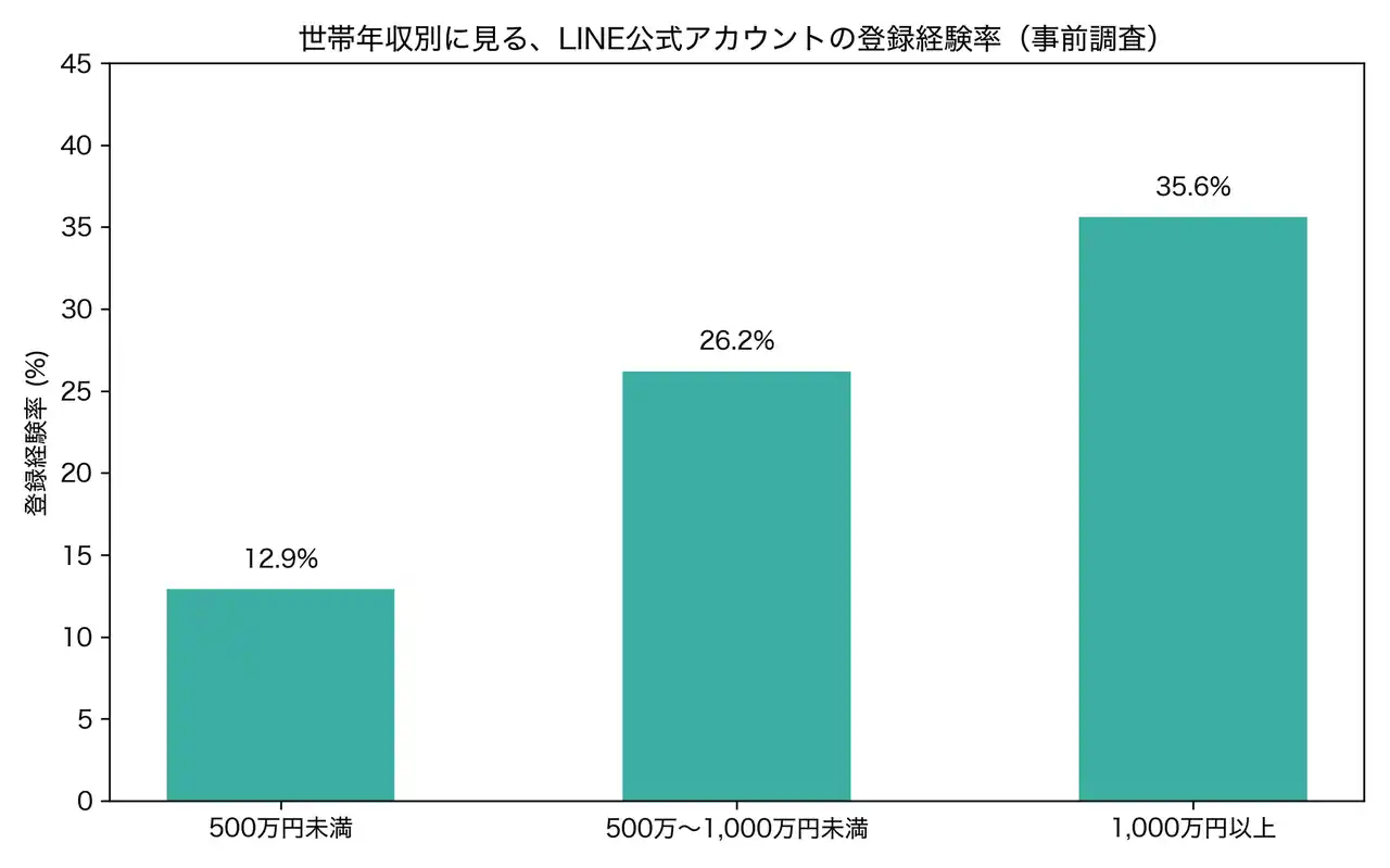 | この結果から、飲食店LINEは誰にでも同じように登録されるわけではなく、相対的に可処分所得が高い層や、利便性・情報価値に敏感な層に届きやすい可能性がうかがえます。 | |||||||||||||||||||||