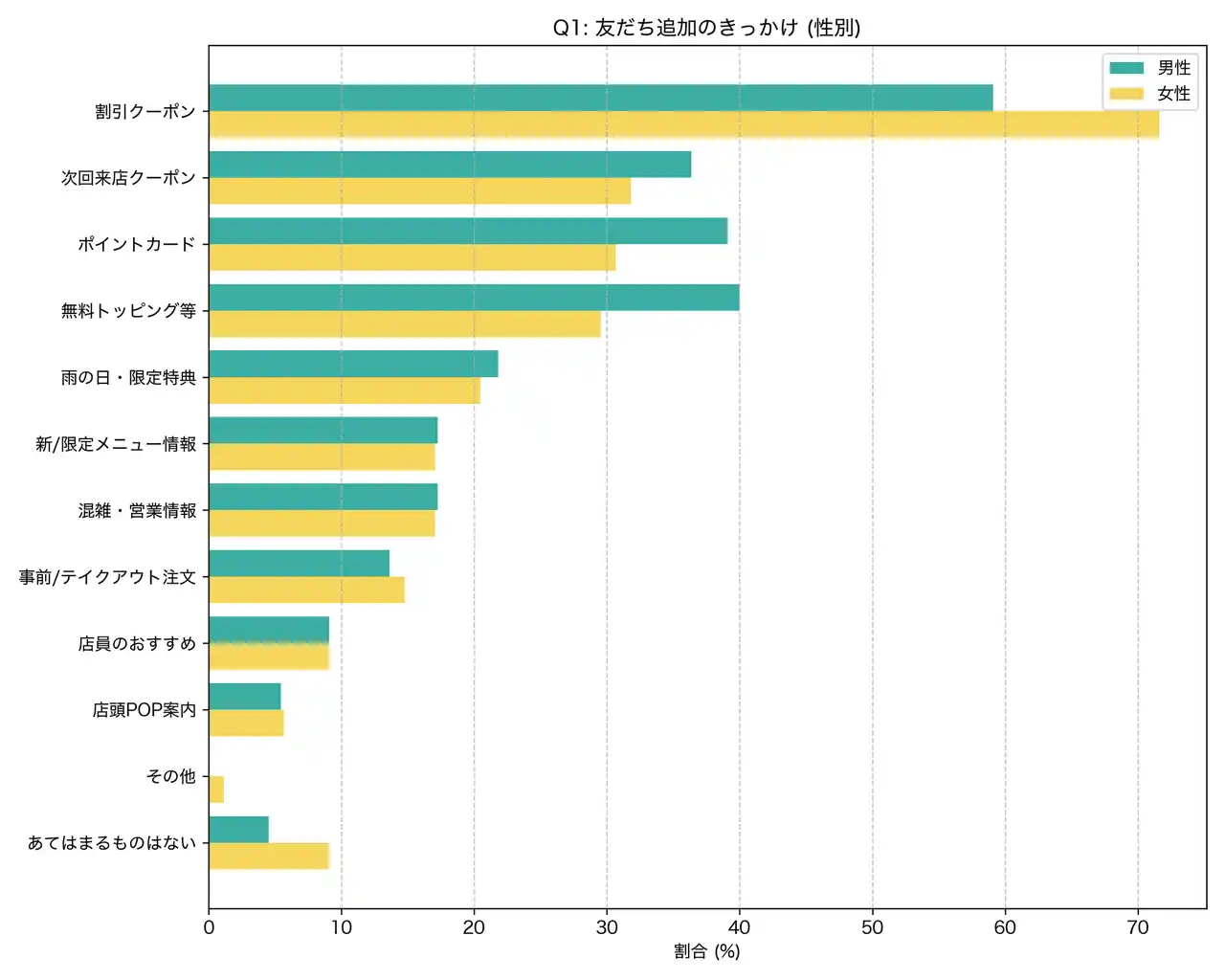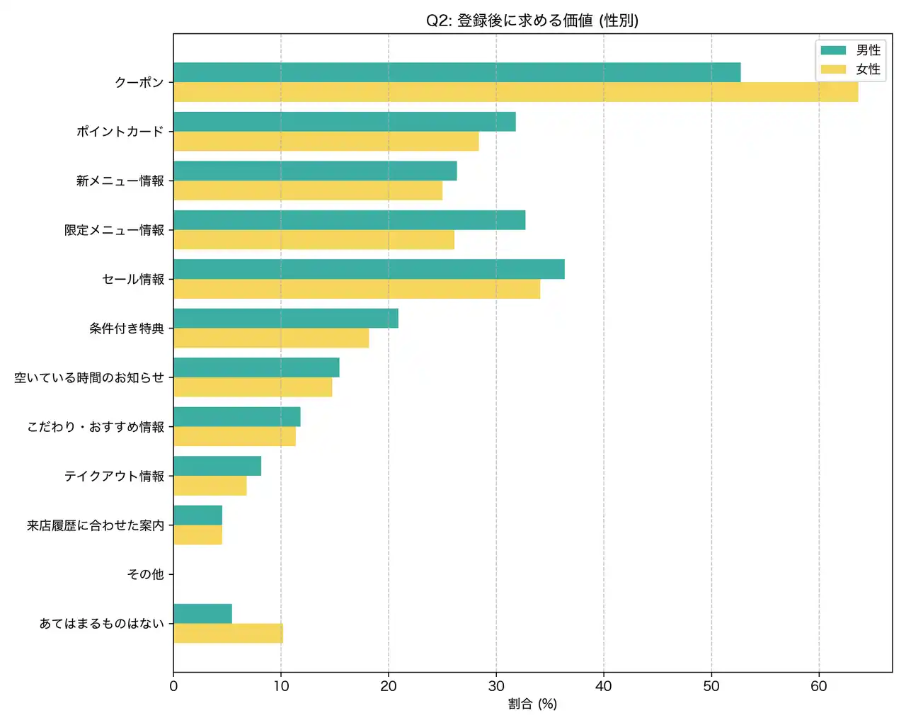 | つまり、女性はクーポンなどの分かりやすい価値に反応しやすい一方で、男性は「登録している意味があるか」をよりシビアに見ている傾向がうかがえます。飲食店LINEでは、登録時の特典設計だけでなく、登録後もお得感や利便性を継続的に感じられる運用が重要だと考えられます。 | |||||||||||||||||||||