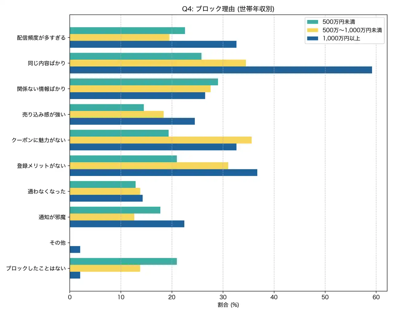 | 一方で、飲食店のLINE公式アカウントをブロックしたくなる理由として「同じような内容ばかり届く」を挙げた割合は、世帯年収1,000万円以上の層で59.2%にのぼり、500万円未満の層の25.8%を大きく上回りました。 | |||||||||||||||||||||