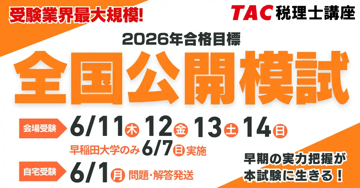 ※TACで2026年合格目標「ベーシック」「速修」「上級」「チャレンジ(4-7月期)」の各コースおよび「直前対策講座」を 受講中の方は全国公開模試がカリキュラムに含まれているため、有料申込の必要はございません。 |