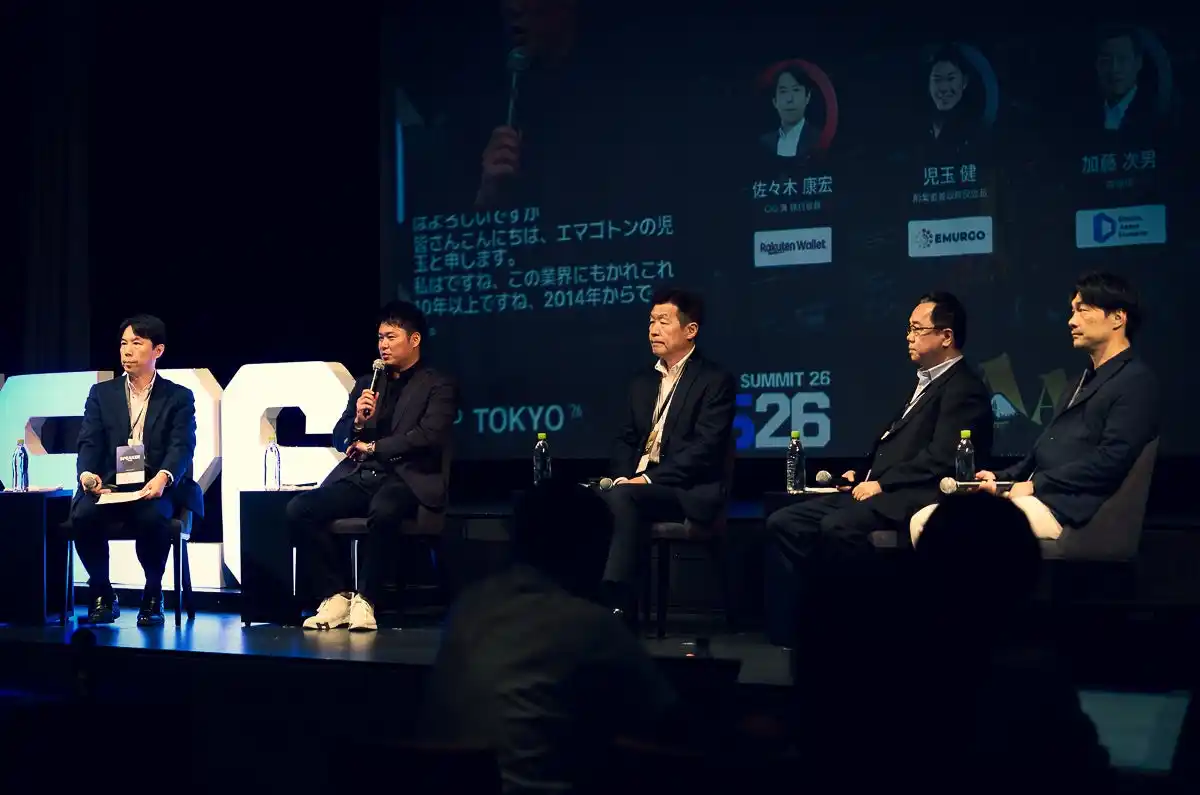 EMURGO 創業者兼取締役会長 児玉 健 / (株)デジタルアセットマーケッツ 取締役 加藤 次男 / FINX JCrypto株式会社 代表取締役社長 CEO Chen Haiteng / G.U.Group株式会社 代表取締役社長CEO 近藤 秀和 / 楽天ウォレット株式会社 CIO 兼 執行役員 佐々木 康宏 (Moderator) |